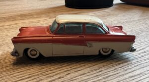Men Ford Taunus 17 M nr. 823 med øgenavnet “Det flyvende Tæppe” er en super dejlig Tekno model. Den er godt lavet og den ligner sit voksne forbillede. Men jeg synes den er mere “amerikaneragtig” og flyderagtig med sine store flotte kofangere og flere farver. Faktisk synes jeg, at Teknos model er pænere end den rigtige bil. Den virker lavere end forbilledet ligesom den er sænket lidt. Det med “amerikanerlooket” er ikke helt forkert. Den bliver ofte sammenlignet med en Ford Fairlane Crown Victoria fra 1955.