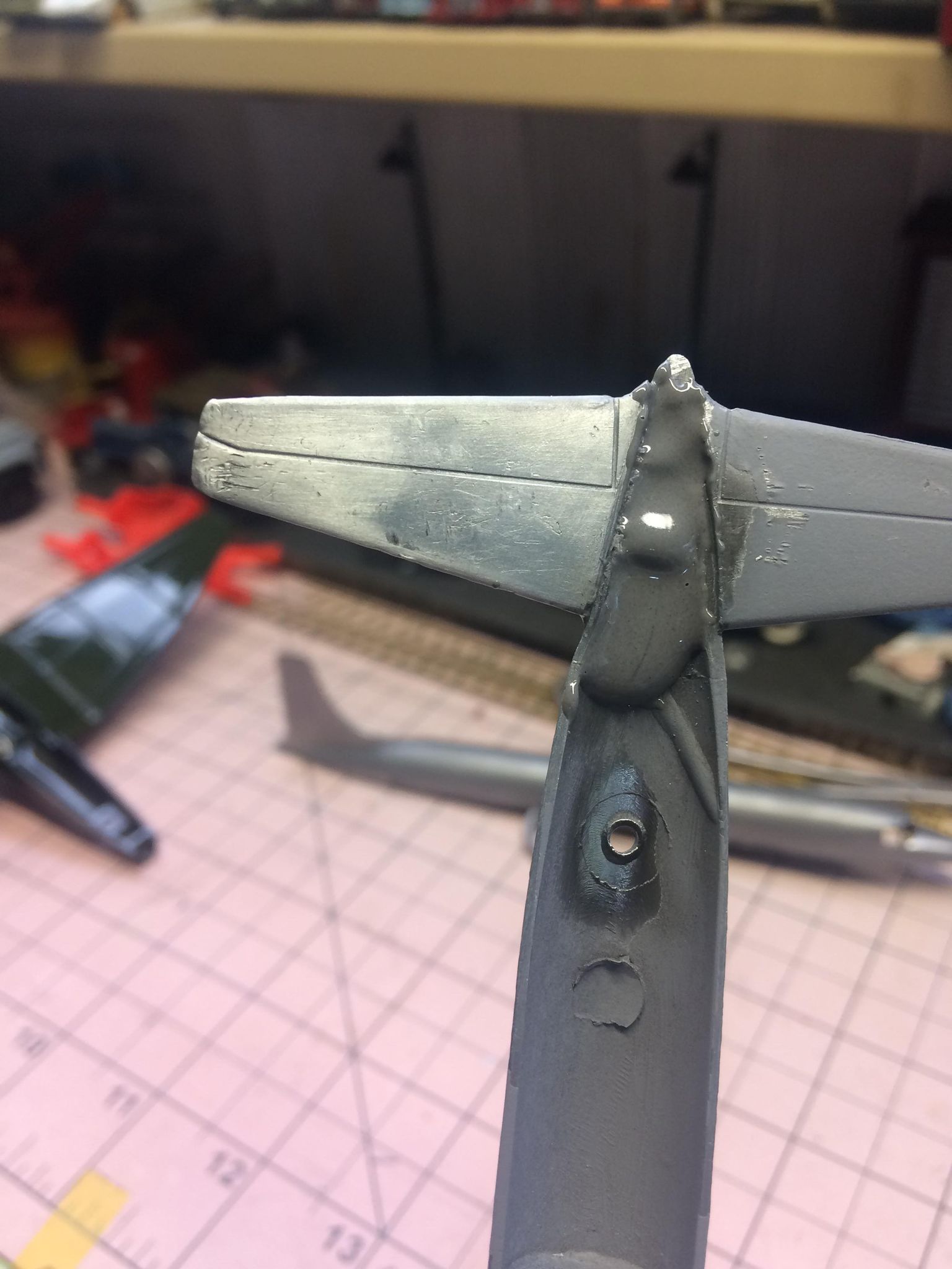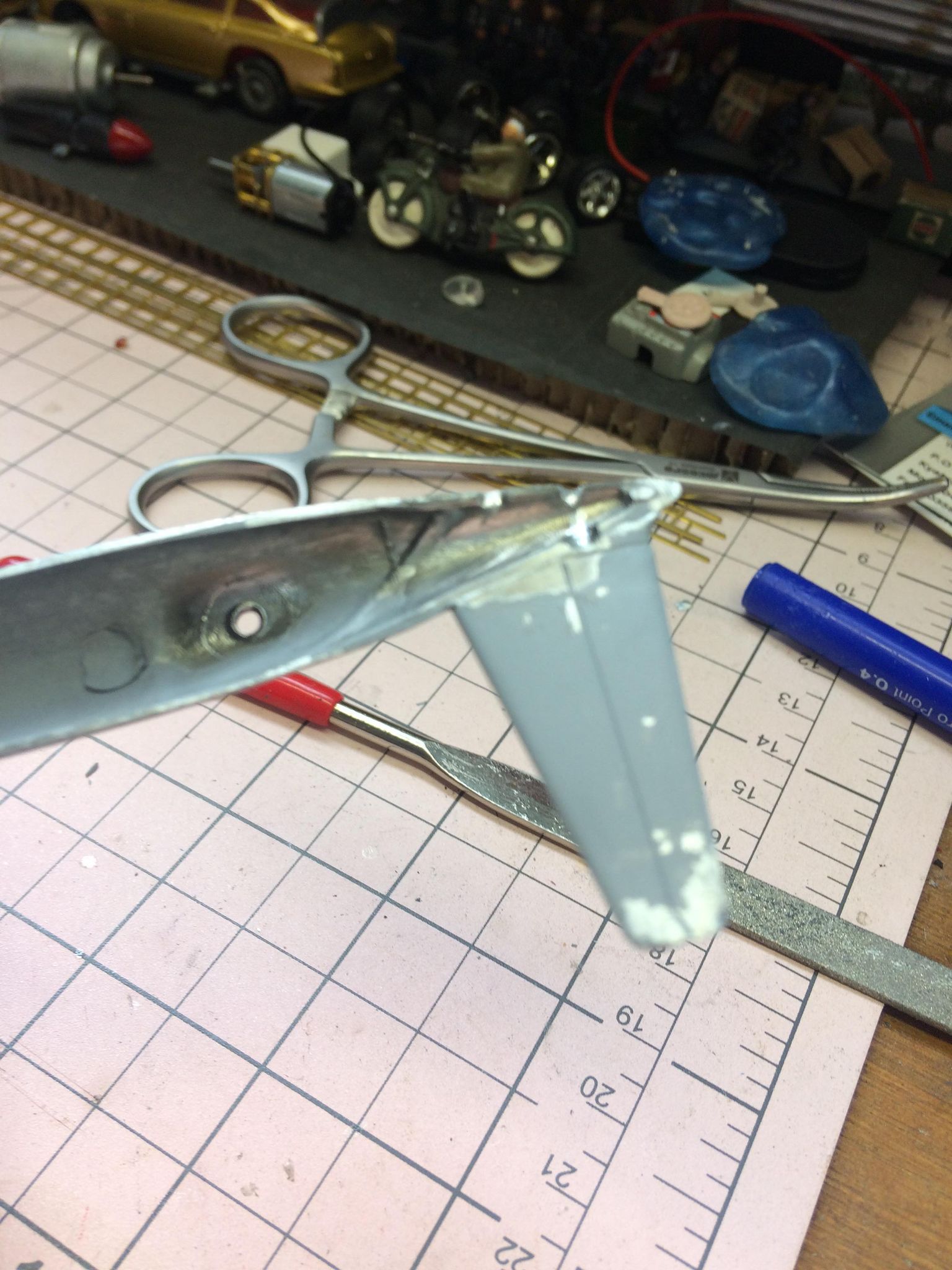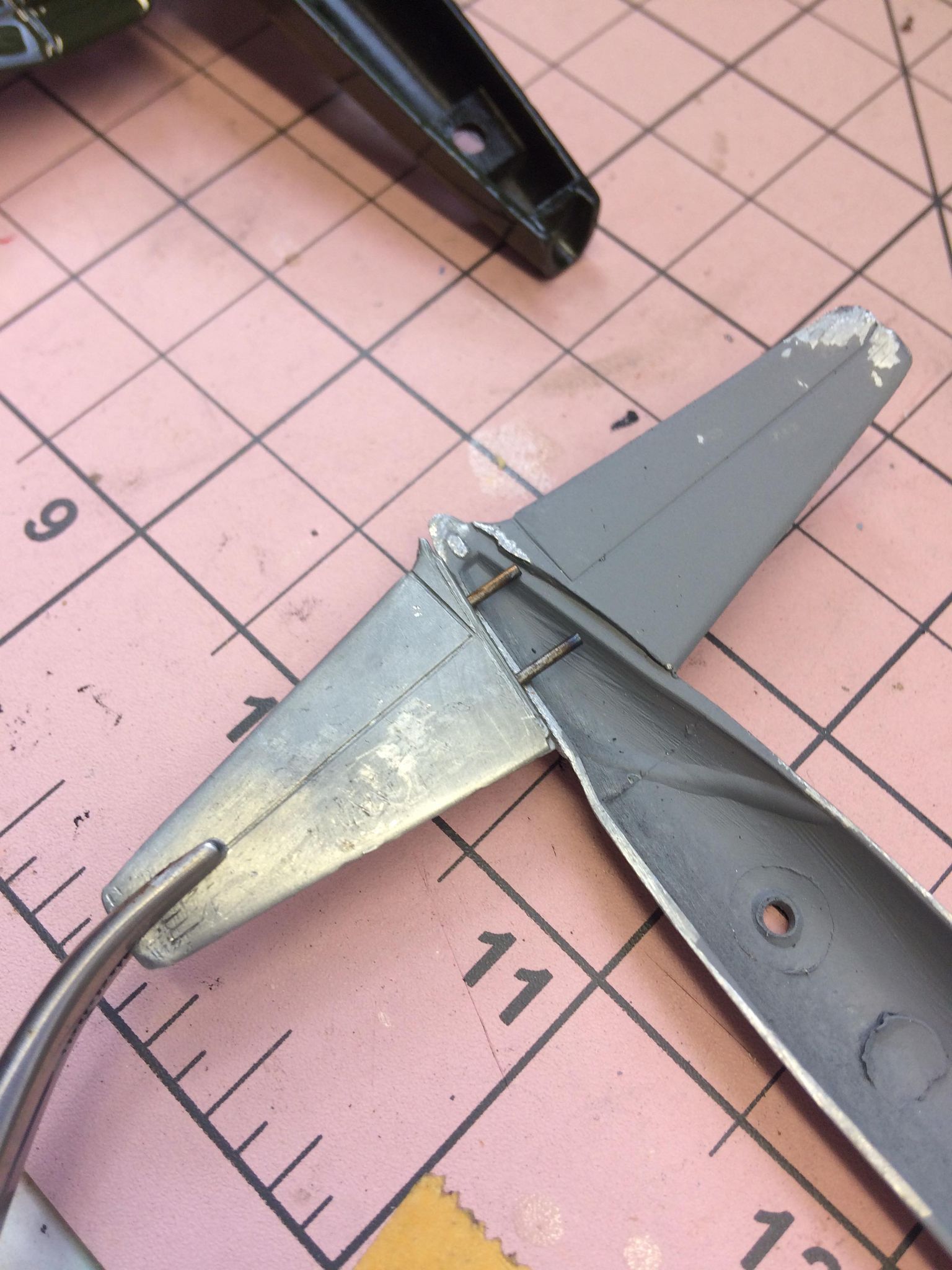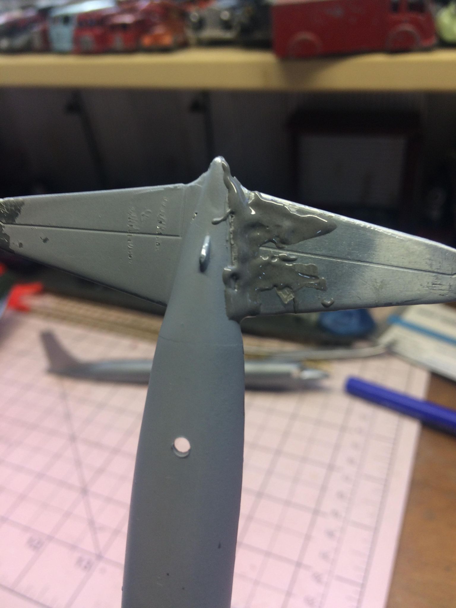 ParticipantWhile waiting for paint to dry I made a start on reattaching tail fin to DC 7 hope pictures are self explaining , my aim is to make it strong enough to be handled once again with out fear of bits falling off .Epoxy is JB Weld Metal 24 hour setting , takes a while to harden off but once set its easy to sand back.In a couple of days I will sand epoxy smooth and adjust to make both body parts fit perfectly before trying to replace broken rear fixing pin .