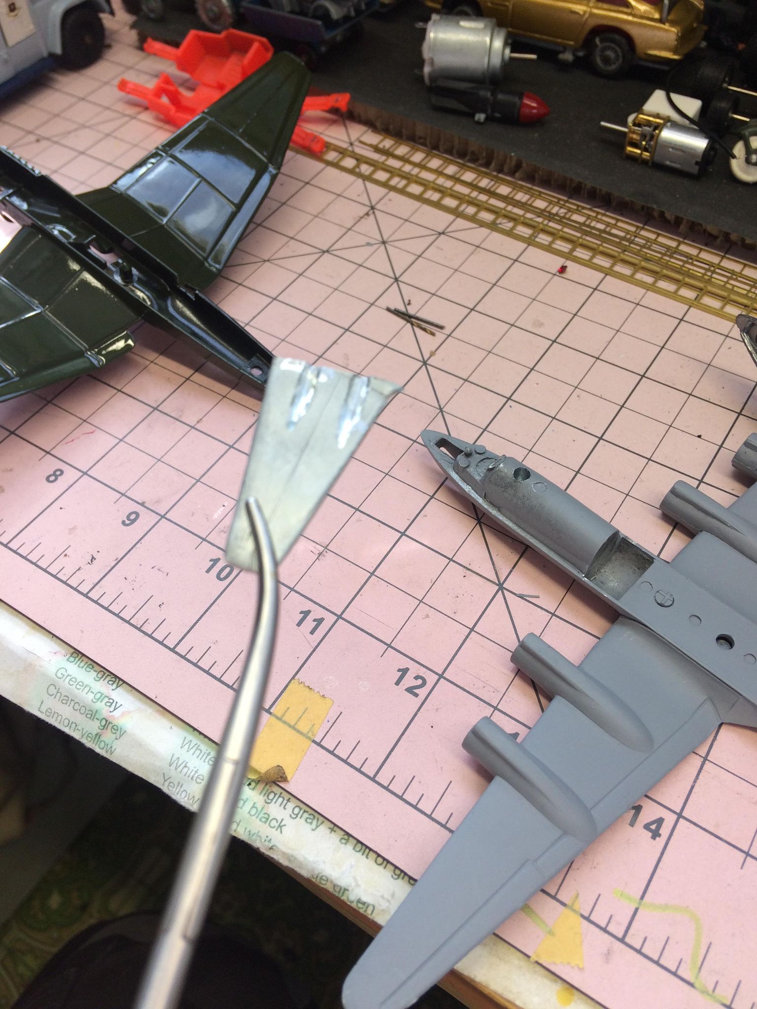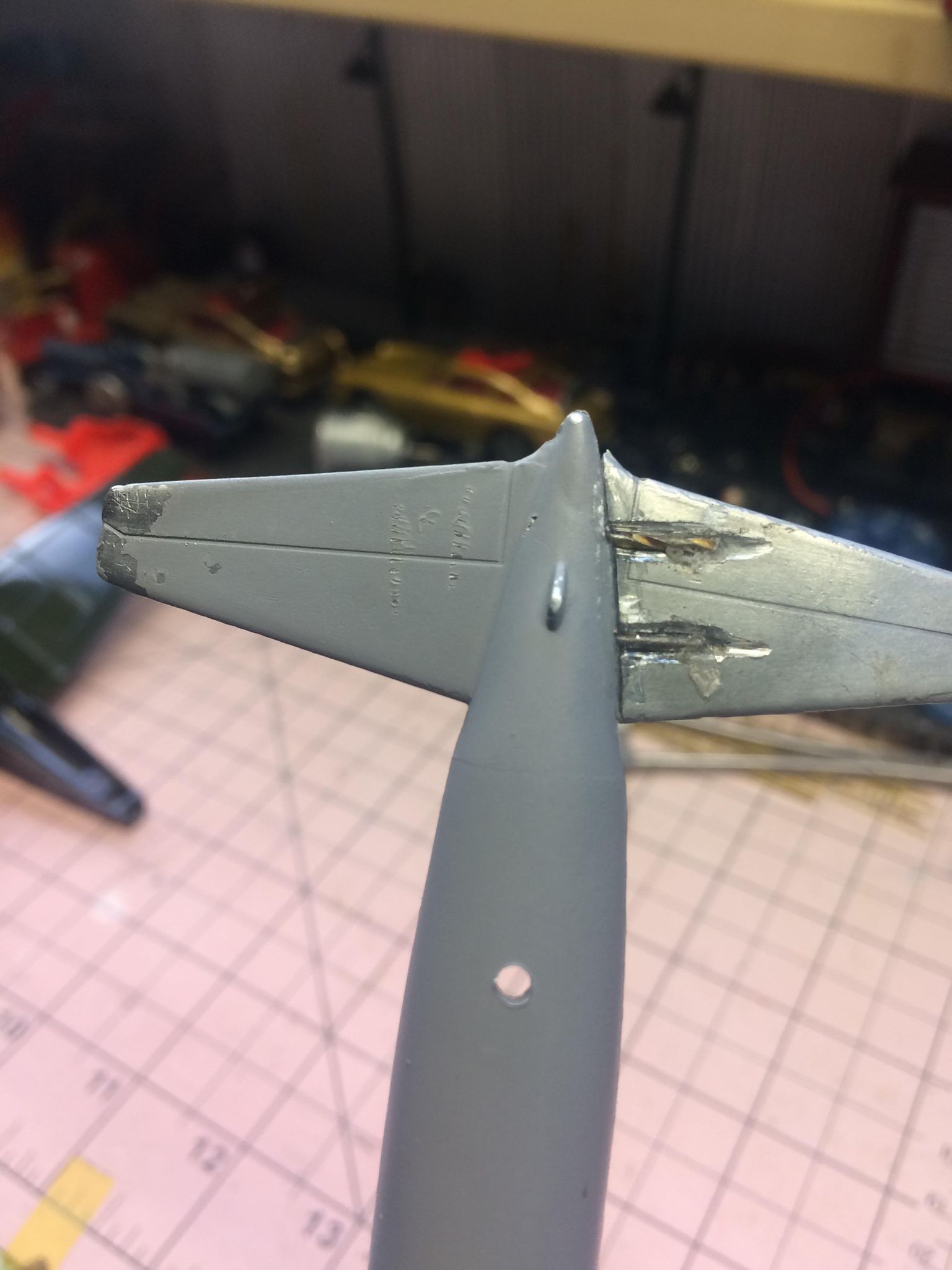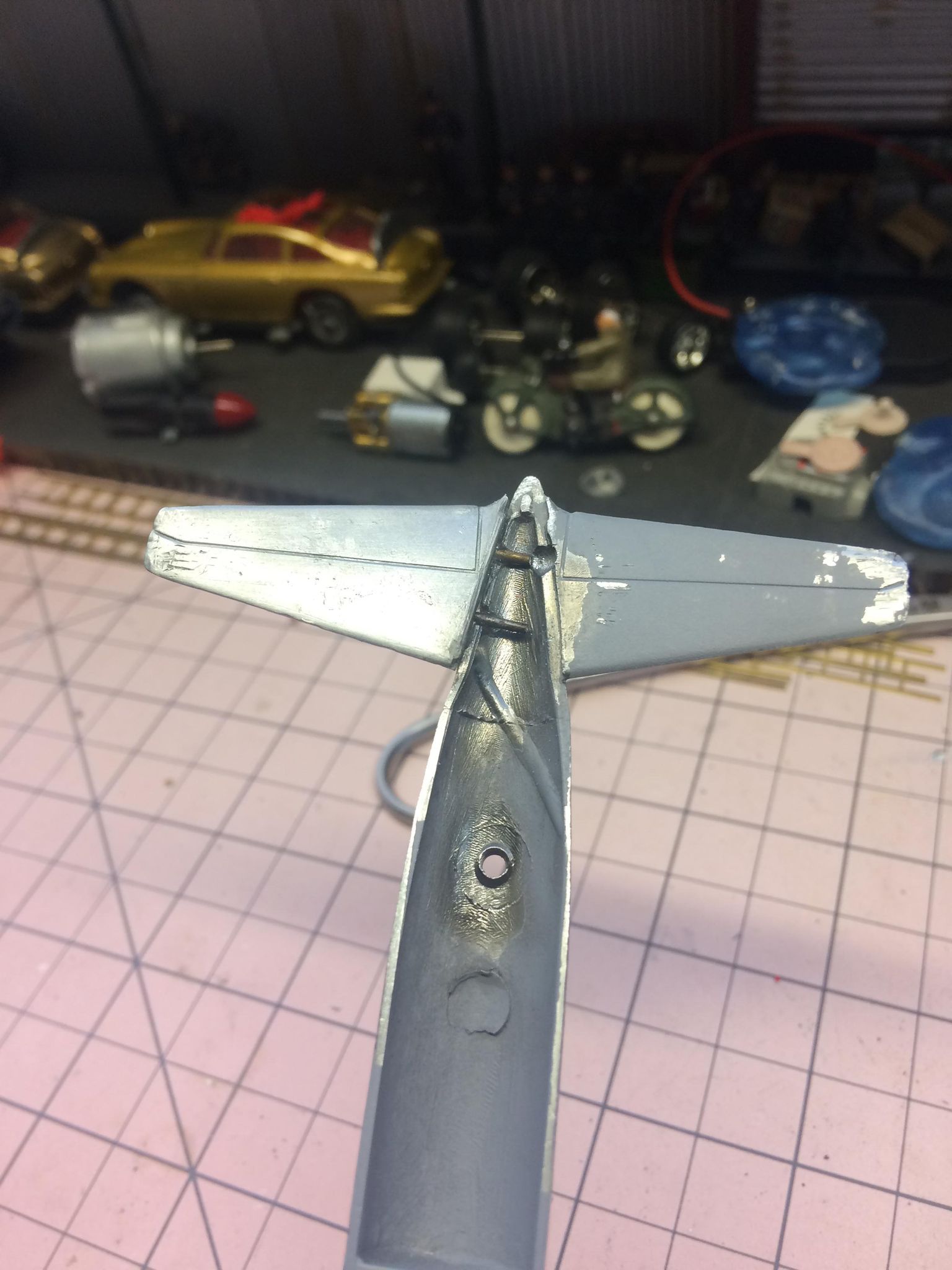 ParticipantWhile waiting for paint to dry I made a start on reattaching tail fin to DC 7 hope pictures are self explaining , my aim is to make it strong enough to be handled once again with out fear of bits falling off .Epoxy is JB Weld Metal 24 hour setting , takes a while to harden off but once set its easy to sand back.In a couple of days I will sand epoxy smooth and adjust to make both body parts fit perfectly before trying to replace broken rear fixing pin .