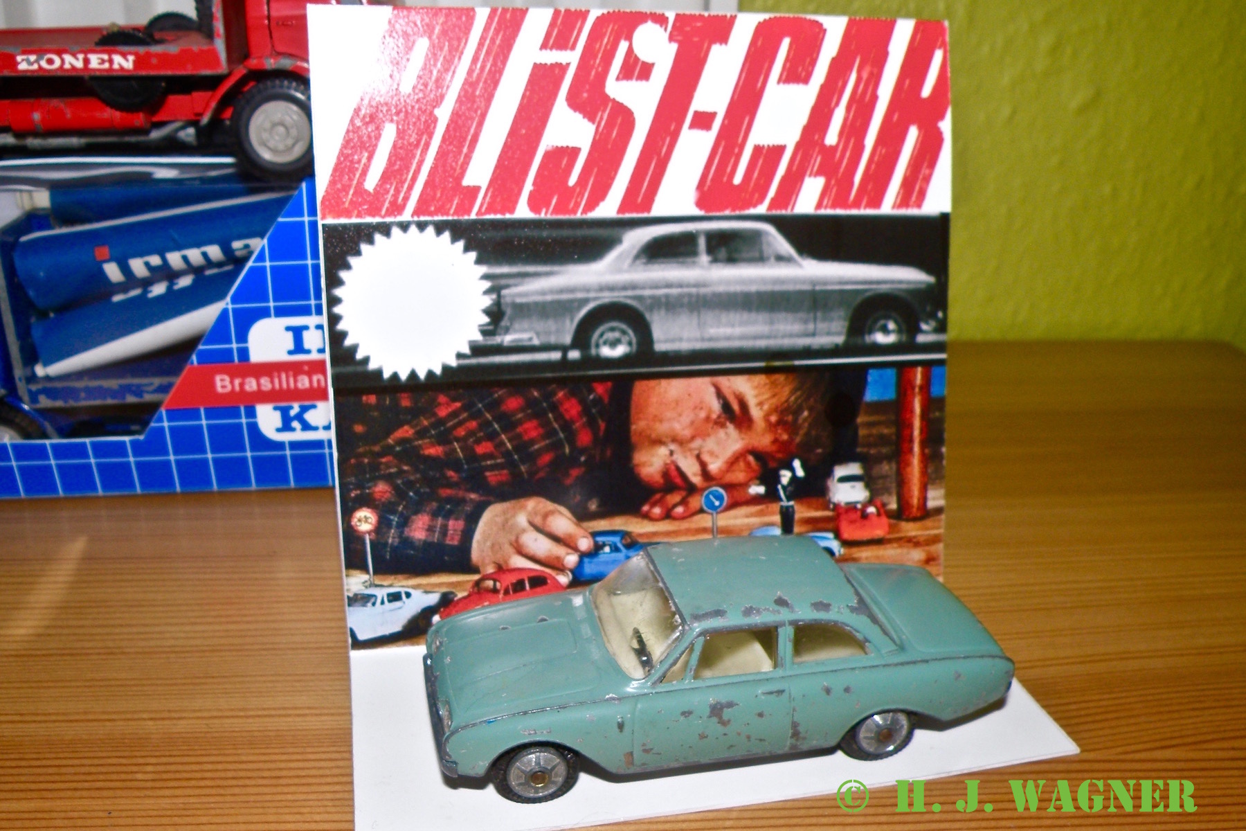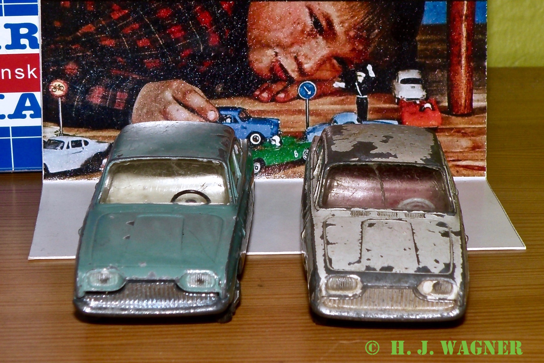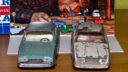 Blist-Car– sad med et par gamle Taunus´r og opdagede en lille forskel… Den hvide er en gammel med metalhjul og Tekno navn. Den grønne er en Blist-Car med Mustang hjul og uden Tekno navn.