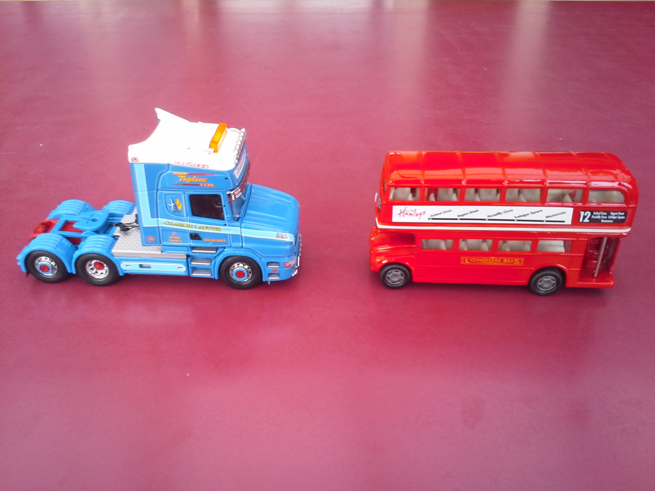Du har ikke nævnt hvilken London bus du har der. Men Corgi og Matchbox kingsize busser ligger på skala 1:64, og det kunne din da også godt ligne….se evt gode sider