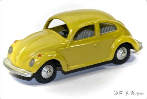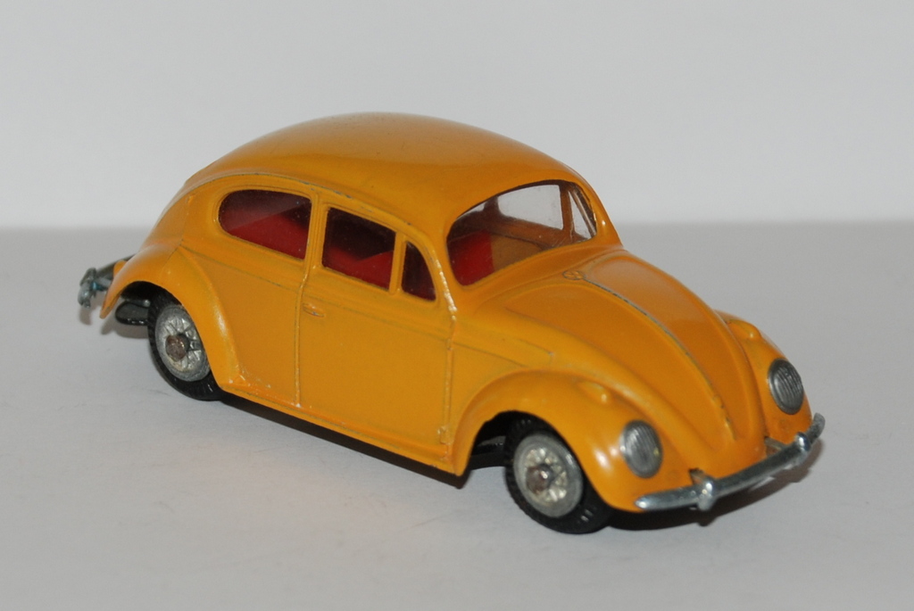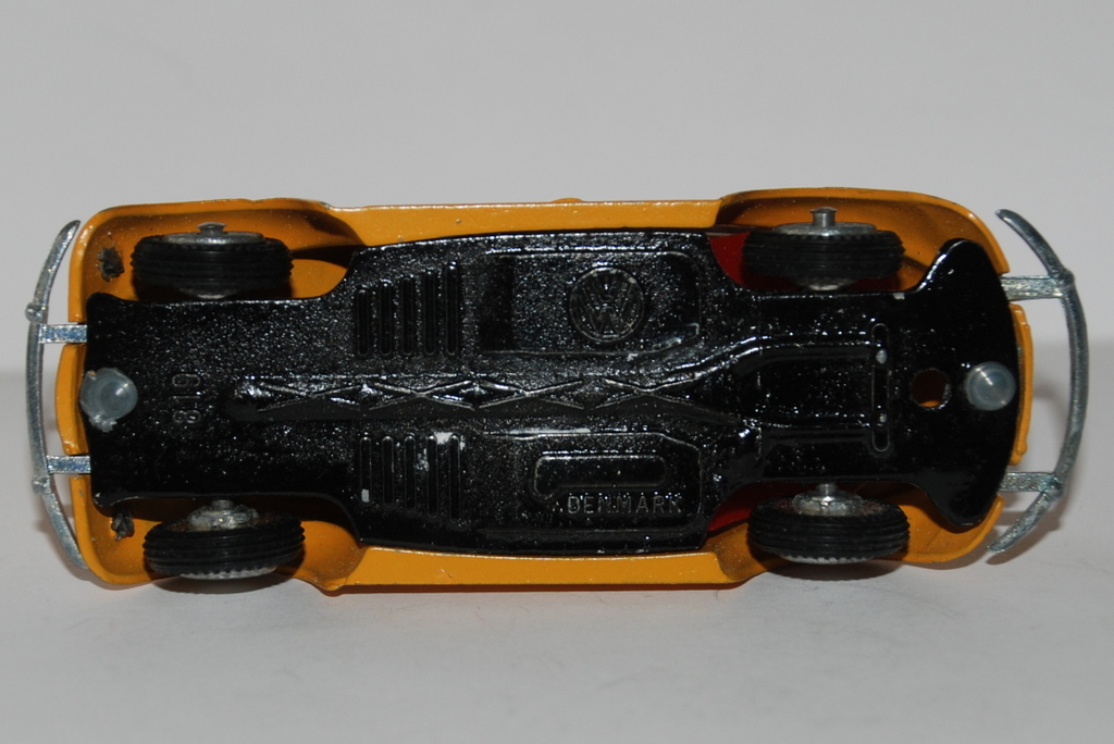ParticipantHans Jørgens gode kommentarer fik mig til at se nærmere på den gule VW, jeg har i samlingen. Endnu en uden Tekno navnet (819c), men denne gang med trådeger. Den kan dog ikke give svaret på brug af maling til lygter, idet der også her er sparet på lygtemalingen. Til gengæld har den sort bund og gul maling både ude og inde samt på trinbrættet.