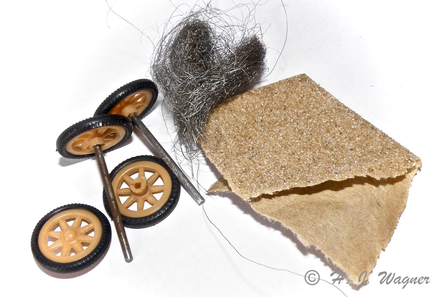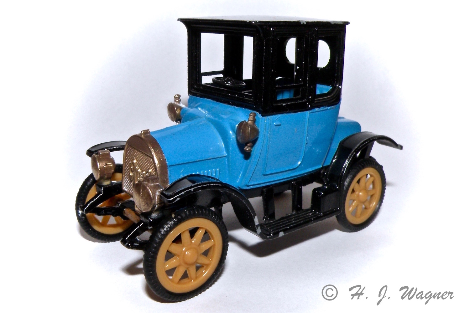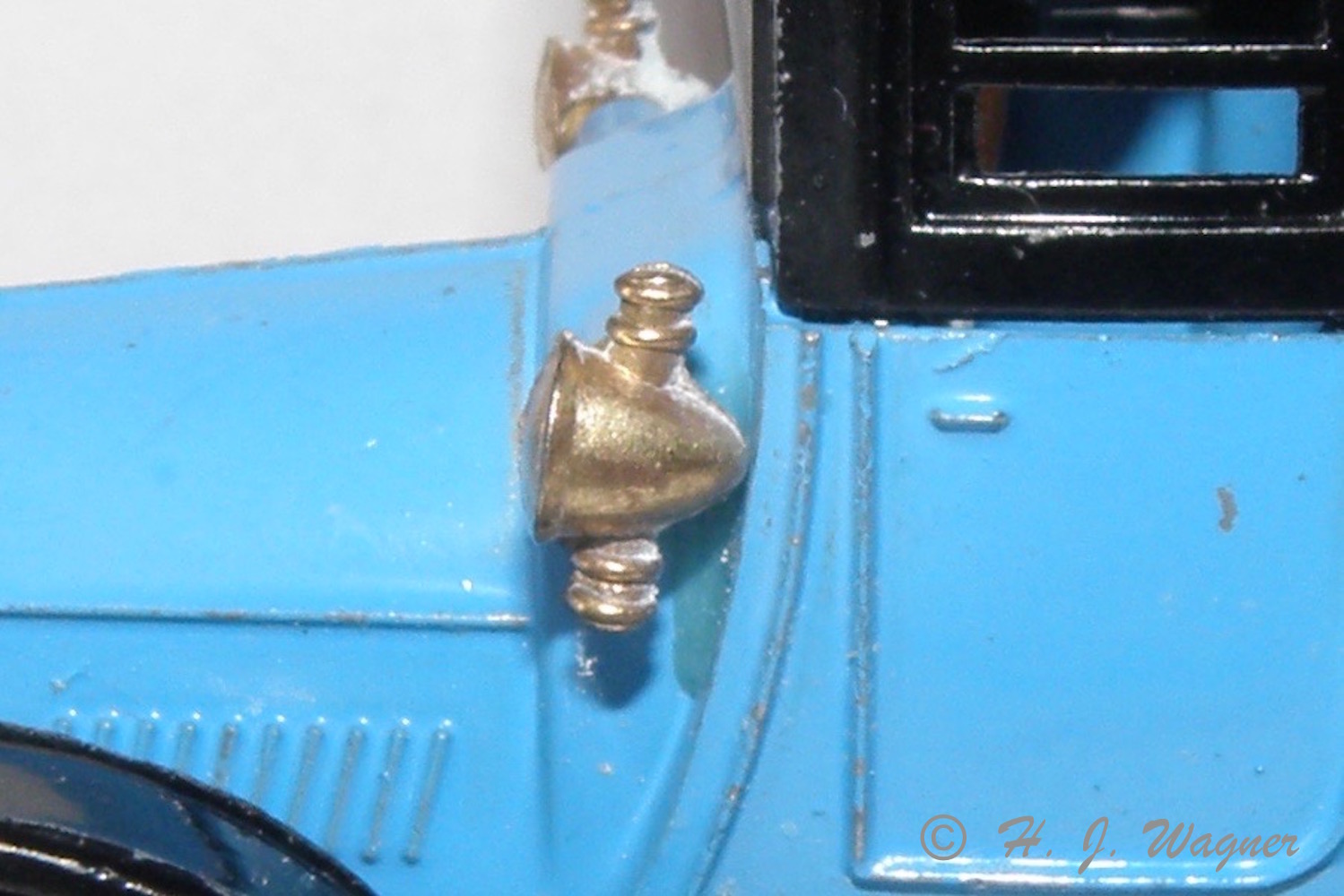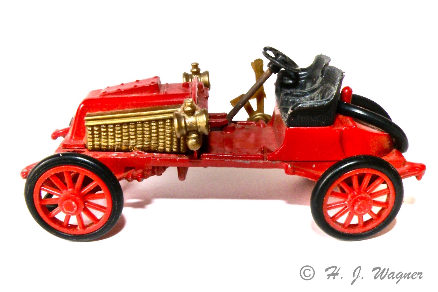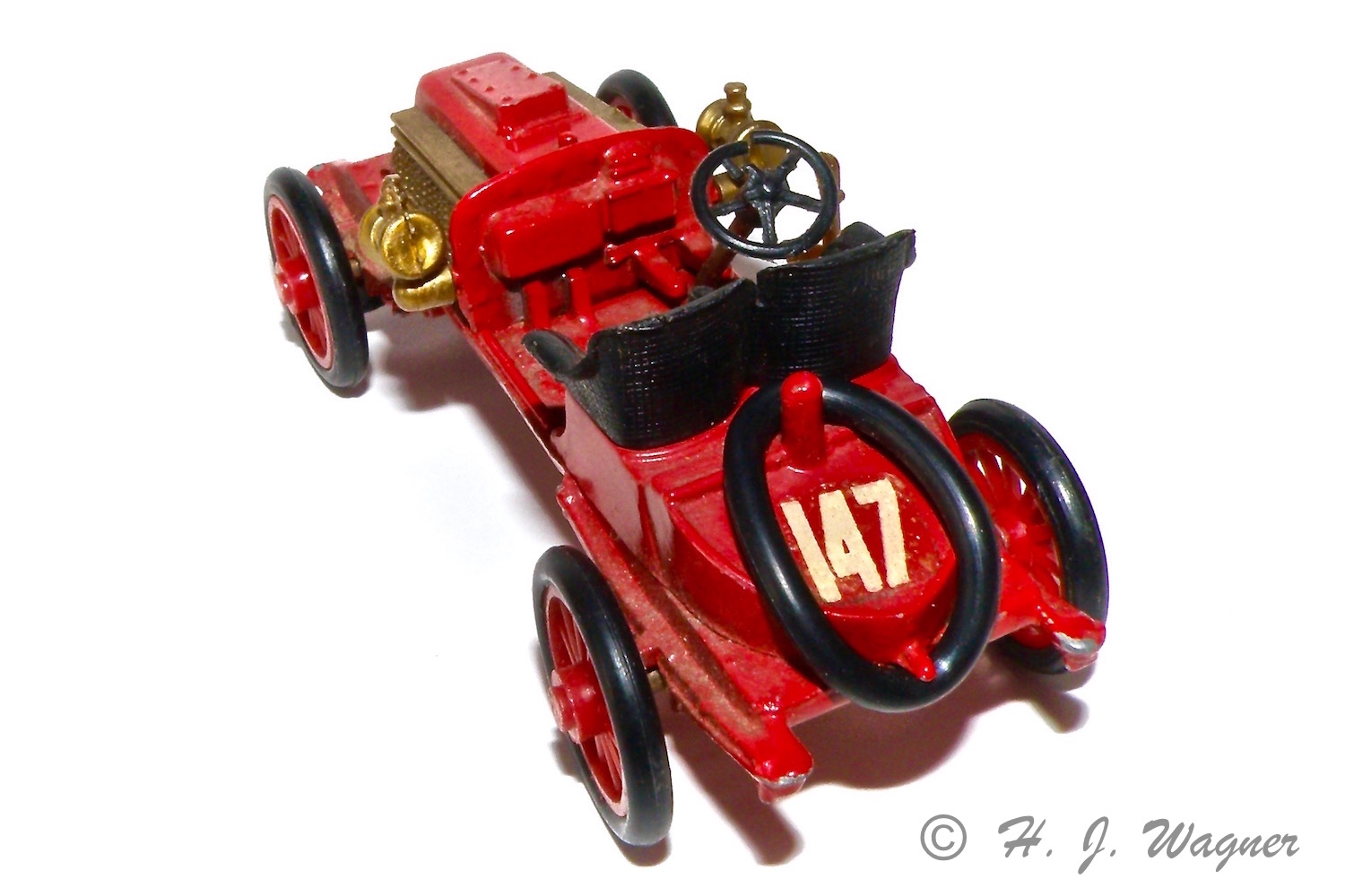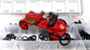 Akslerne var rustne så de fik med slibepapir og ståluld.Renault Course – 1902 – Paris- Vienne fra “Safir” skala 1:43. Modellen er afmetal med plastik dele. Dvs. hjul, lygter, kølere sæder og hondbremse og selve rattet er af plastik. Modellen manglede et reserve dæk der skal sidde på to tappe bag på. Fra Harald Skrald har jeg en sortiment box med O-ringe i forskellige størrelser. Der var også en der passede til denne bil.