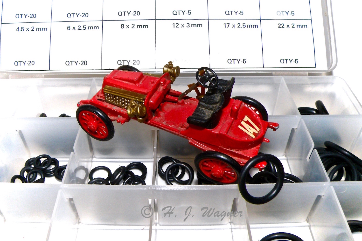 Oringe i sortiment box, passer til en del veteranbiler fra Matchbox, Ziss, Rami, Gama, Safir. Der er mindre O-ringe der passer til de små Matchbox Traktore og trailere, osv.