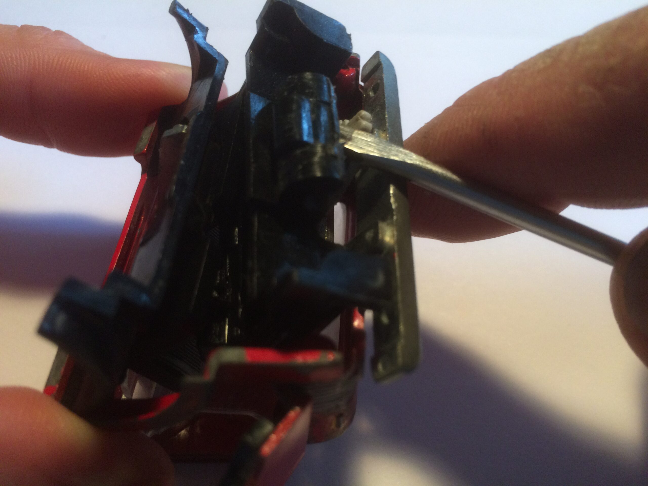 Man åbner dørene ud løser den lille “hestesko” lås No 18 (tap til venstre)trykkes forsigtig ind mod midten)her efter sættes en skruetrækkeren som på billed mellem kofanger og plastik “hængslet” hold fast i hytten og tryk håndtaget på skruetrækkeren ned mod bordet så lyfter du indmaden ud af hytter der skilles ad i alle dele når du skal ha ruden ud trykker du forsigtig på bagruder ind i hytten 😄