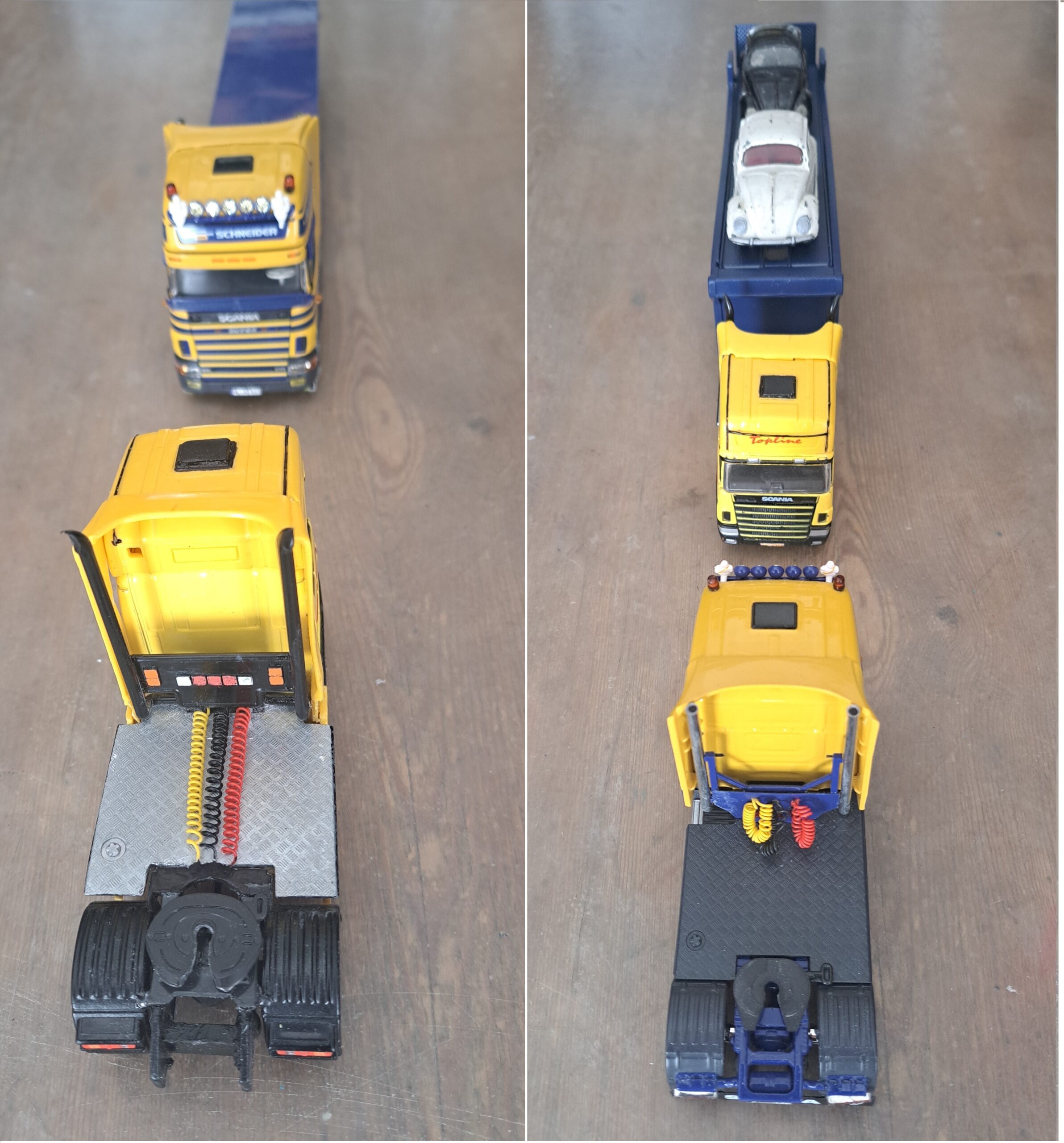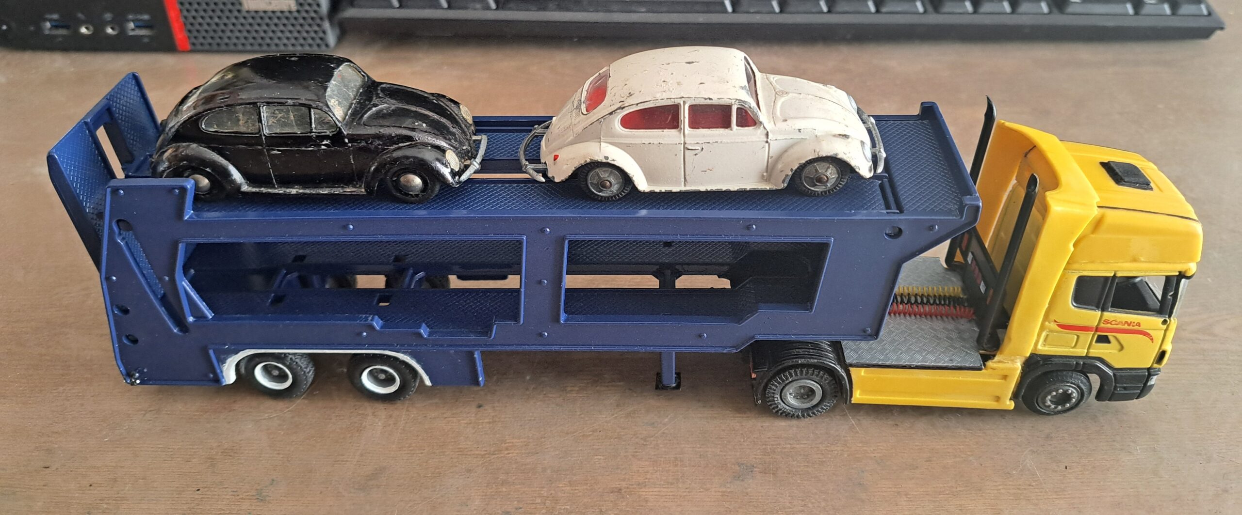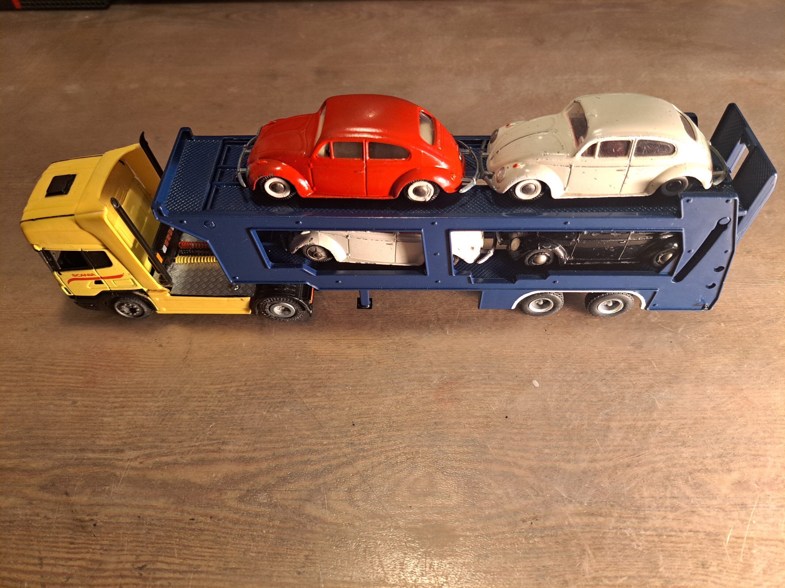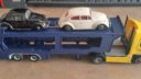 Vw biler – trukket af en Scania.