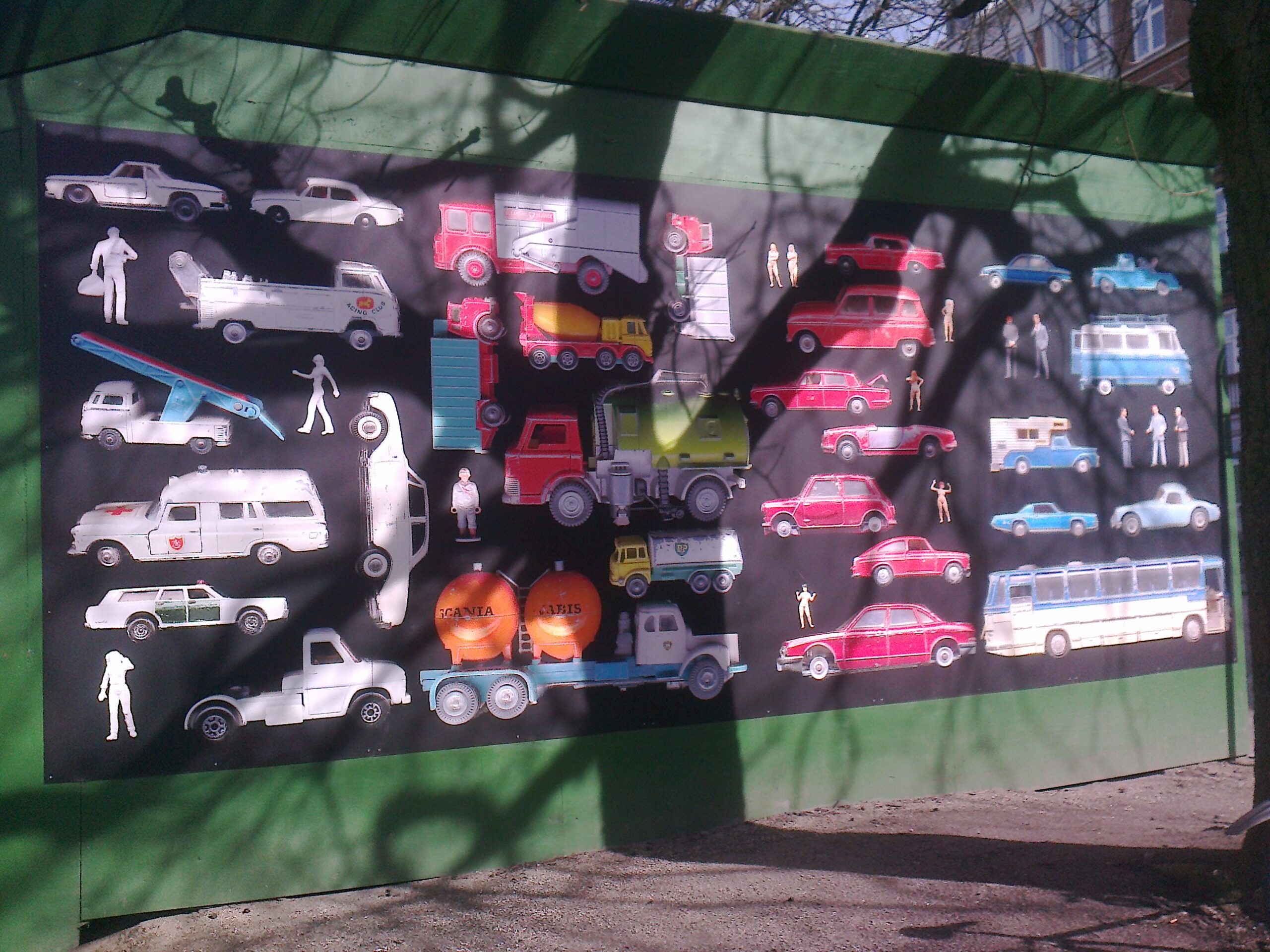 Sjovt hvad “vores” biler kan bruges til; billede af “Kunstværk” på plankeværk til Metro byggeriet her i Kbh. Har selv flere af dem.