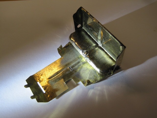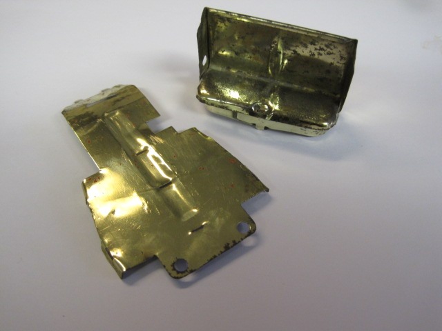 Jeg har set en messing bund før uden at tænke nærmere over det, Men den sad på en Packard. Og nu kan jeg så sidde her og ærger mig grøn i hovedet 🙁 for den er solgt —— Men en billig fornikling, tyndt lag aluminium, kan se gulligt ud. I veteran sammenhænge er der nogen der forsøger sig med hjemme forkromninger, af små ting, og de kan opleve denne gullige farve. Man behøver ikke at ridse i bilerne, for magneter burde ikke kunne sidde på en messing plade, alt afhængig af legeringens kvalitet.