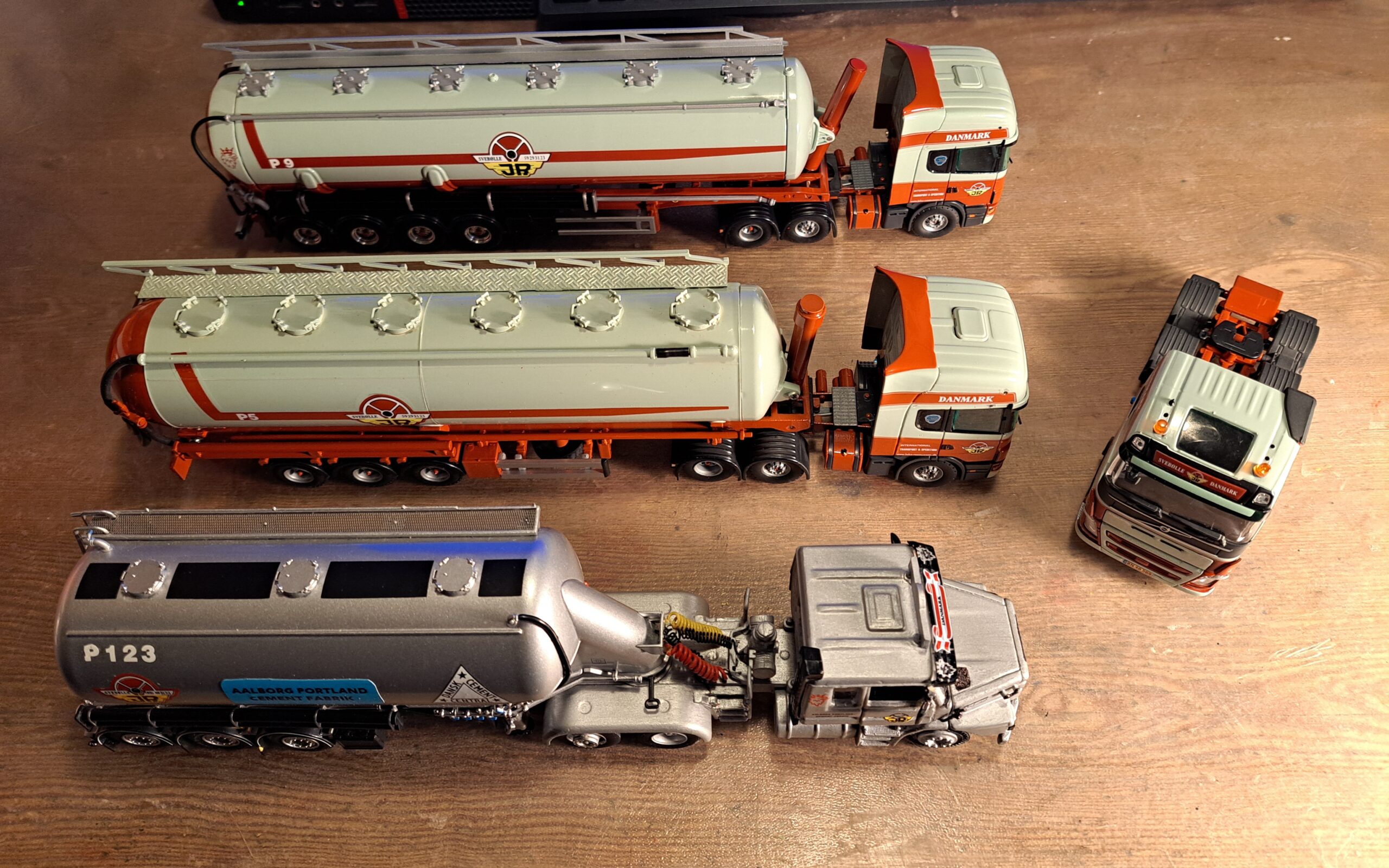 3 pulvertransport, 2 tankbiler og en gardintrailer.