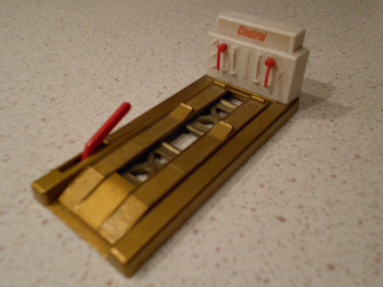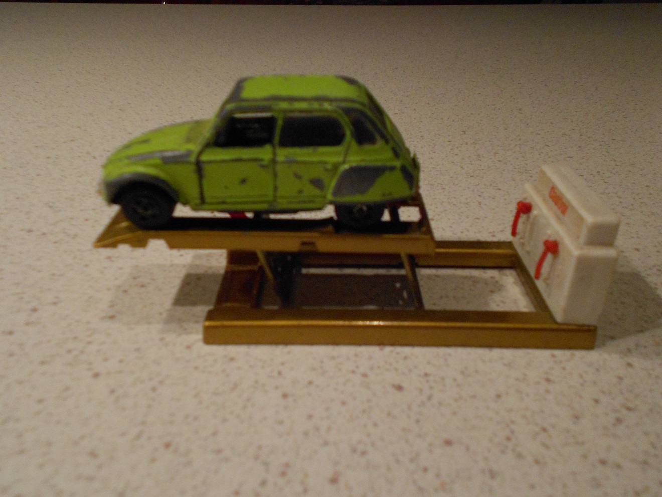 Din Bertel, er en Matchbox accerypack med plastik olie suger, fra omkring 1970. Iøvrigt en udemærket ting. Der findes tillige en rød Matchbox lift lidt ældre der passer til Matchbox tankene og tankstationen med ESSO navnet. Der findes endnu en rød støbt, samt en lyseblå også støbt af metal. Jeg mener at den ene røde blev solgt af Tekno, men er ikke helt sikker. Fælles for den røde, vidst også den røde Matchbox og den lyseblå er, at der ikke står navn i. Det er ikke mange autolifte der er at finde generelt. Wiking havde en meget enkel en af plastik og tråd der passer til små biler i skala omkring 1:87. Men legetøjs biler kom åbenbart ikke på værksted, før det var for sent og de var helt smadrede.