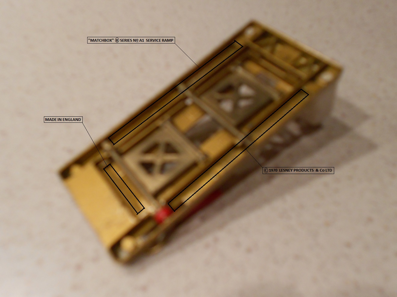 Min er også en Matchbox series A-1 service ramp 1970 Lesley products &Co Guldfarve.