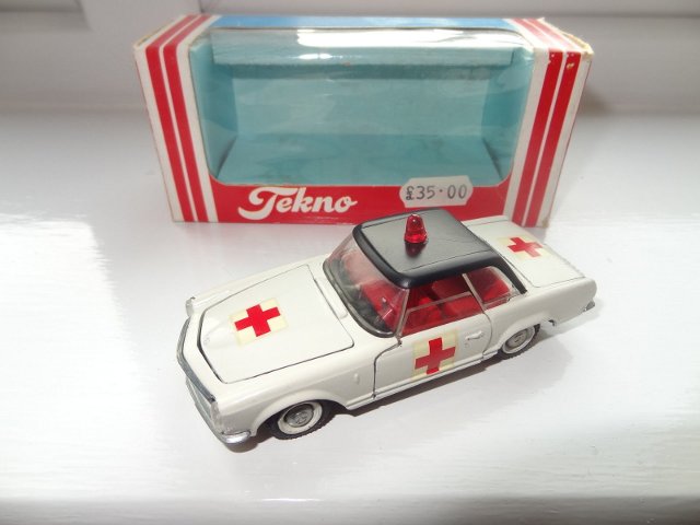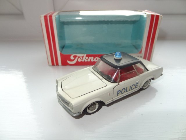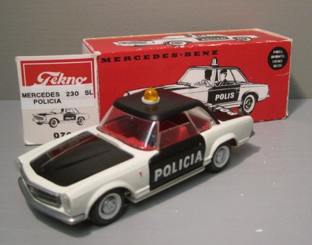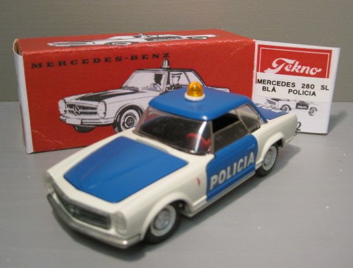 1) Jeg er nu også ret sikker på, at Policia udgaven ikke er polsk men derimod den spanske udgave! Denne bil er “korrekt” i sort/hvid udgaven! Det er min helt personlige mening, at den blå/hvide MB 230 SL udgave er en af flere “Den eneste ene” modeller, formegentlig med forbillede i Tekno nr 819 VW 1200, der netop er produceret i den blå/hvide udgave som Policia. I øvrigt kan du se den både i sort/hvid og i blå/hvid udgave på min hjemmeside under Tekno> Personbiler
