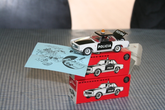 JA det får tilsyneladende ingen ende, for Mercedes Benz 230 SL er også solgt i en Dalia udgave som 230 SL! Dalia var samarbejdspartner med Tekno omkring Ford Taunus Transit (kan ses i Teknobogen (udgave 2007) på side 197)) men, Dalia solgte altså også Tekno i Spanien. Med hensyn til Politi serien, så blev den svenske udgave “POLIS” leveret med gul taglygte og senere blev den spanske “POLICIA” også leveret med henholdsvis blå eller gul lygte.