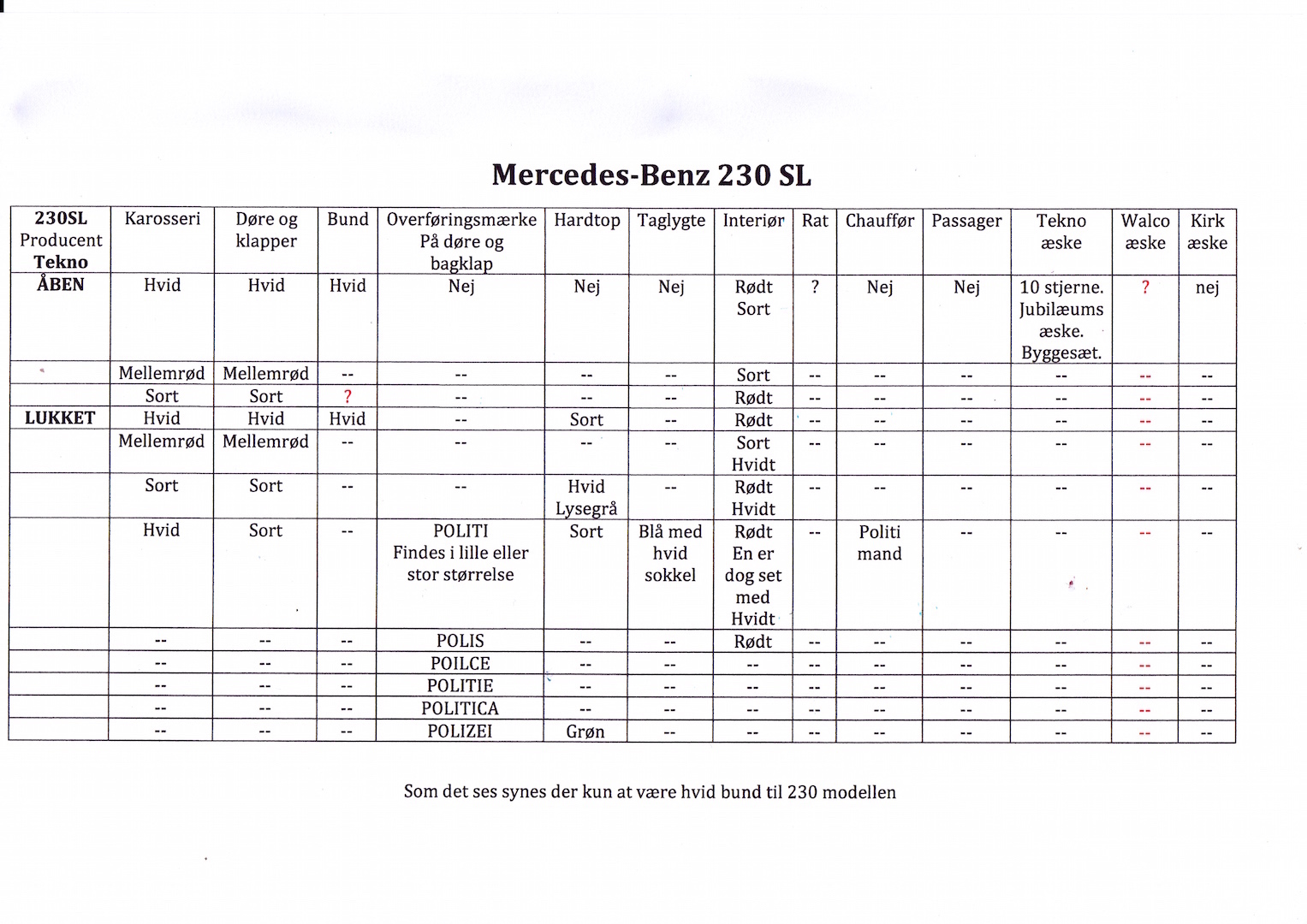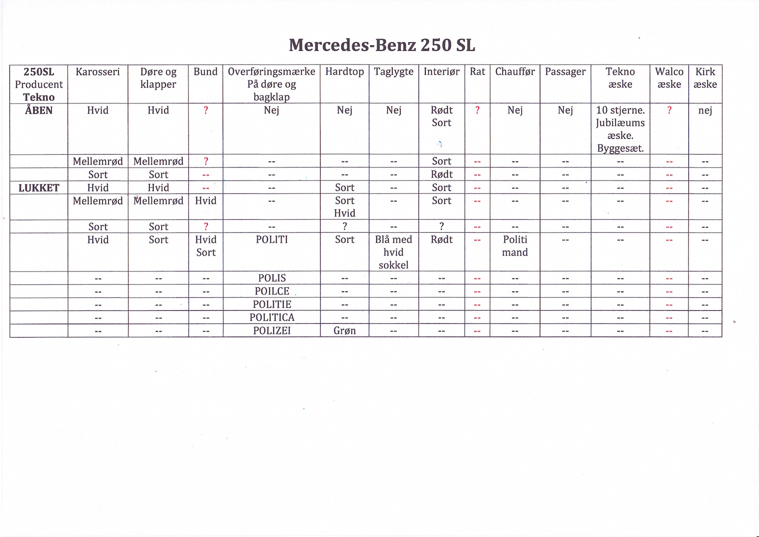 ParticipantPS : Vi har ikke snakket politi udgaver før. Men kan oplyse at Tekno bogen fra 07 omtaler kun modellen som hvid med sorte klapper, døre og hardtop, med blåt blink — Politi, Police, Polis. og hvid bil med grønne klapper og døre, sort hardtop med blåt blink, som Polizei. Og man mener det er alle modeller 230-250 og 280SL der findes som de pågældende politi modeller.