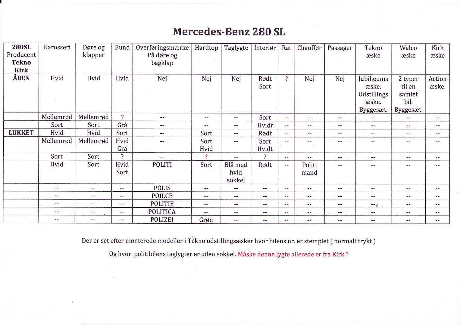 Jeg betvivler ikke din ekspertise, men der er nu altså en lille skygge i din viden :-)! Når talen går på Mercedes Benz 230-250-280 SL glemmer du de biler der kom på markedet gennem Walco, alle disse biler kom jo fra både Tekno og Kirk og her er bla. biler i 280 SL udgaven i sort! At Mercedes Benz SL ikke skulle være produceret i POLICIA udgaven kan jeg tilbagevise jf. billederne nedenfor. Det er jo stadig sådan, at der kommer biler frem i lyset (fundet af arvinger o.lign) og en af disse modeller er netop POLICIA, der er produceret helt op til lukningen af Kirk. Med hensyn til POLIZEI i Teknobogen 2007.. Jeg vil mene, at det er billedet der spiller dig et puds:-) I min bog og specielt i 1997 udgaven (samme billede)er bilen grøn med grøn tag om end billedet er noget dårlig, men med lidt skarp lys, får jeg den til at være grøn. Vedr. interiøret! Det er for mig helt umuligt, at kontrollere eller få styr på, idet jeg har set alle typer i alle modeller men med hensyn til den Hvid/blå udgave, så er jeg nu altså ret sikker på,(indtil nu) at den er hjemmeproduceret!