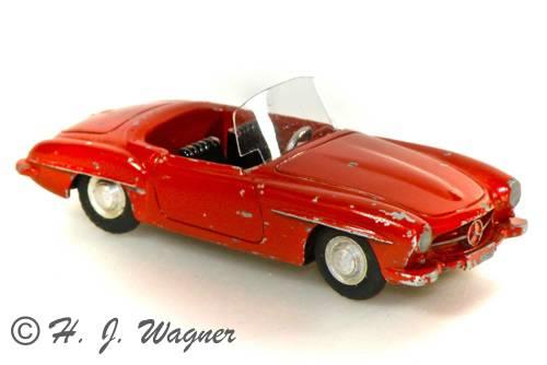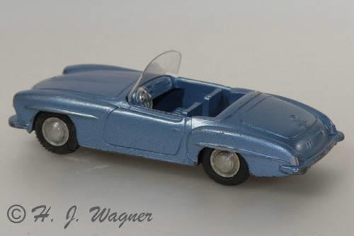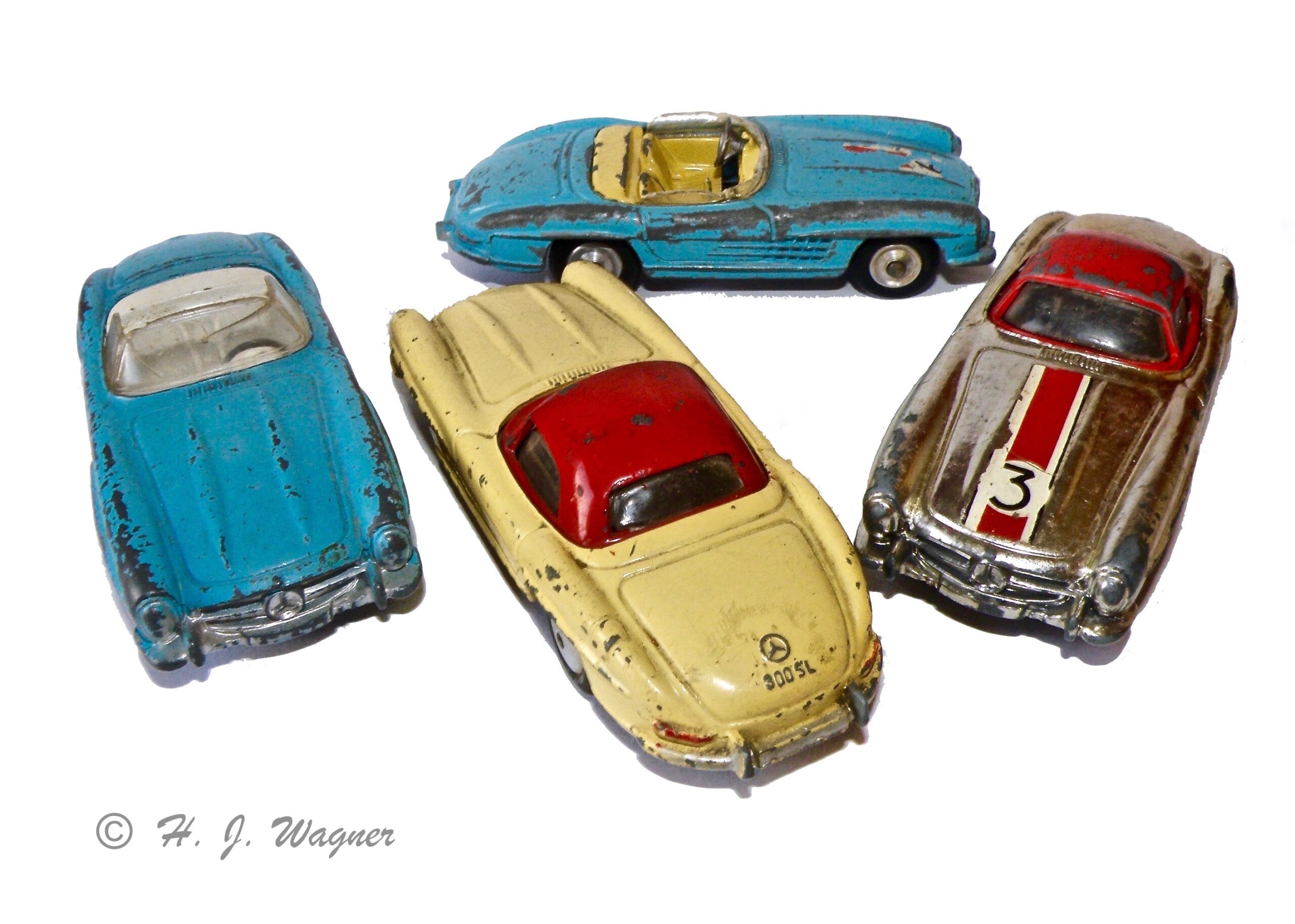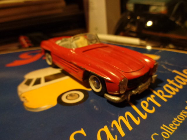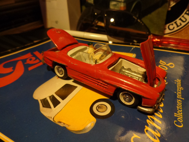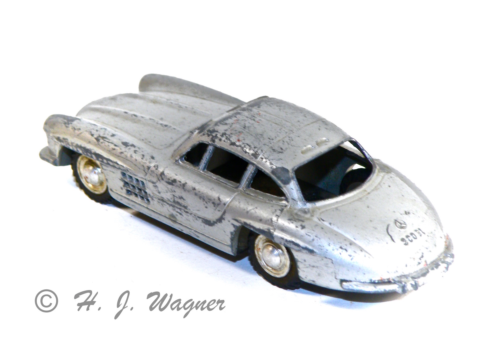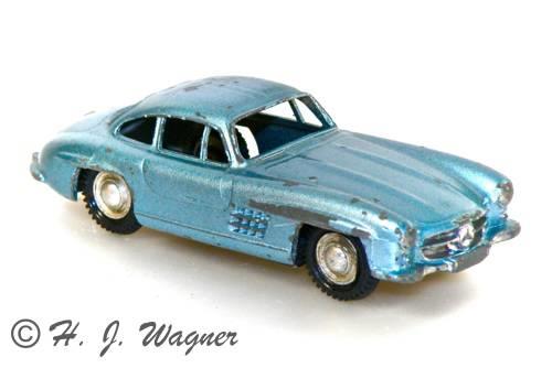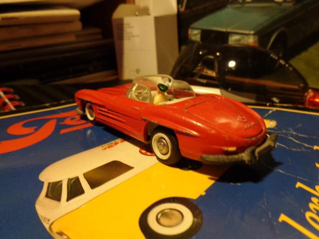 ParticipantHar lige gang i nogen Corgi reservedele, og kommer forbi mine Corgi Mercedeser.. 300SL versionen findes i flere versioner. Åben nr. 303 og lukket nr. 304.. Det er de første fra omkring 1958 uden affjedring. Stadig med pladehjulene kommer begge modeller med affjedring og nr. bliver 303S og 304S (S=suspention) Frygtelig fjeder. En metal bladfjeder på langs af hver aksel. Skriger og bremser hjulenes rullen, og har det med at ruste fast så den ikke fjedre. Så får den de andre hjul i 1961. Jeg har repræsenteret pladehjul uden fjeder der sidder fast på akslen. Løse pladehjul og den senere alm. hjul model alle med fjedre. Den åbne model kommer så omkring 1962 med en chauffør og får lidt forskellige nr. 303S/2c eller 303C… Den kender vi alle nok aller bedst fra Tomte Lærdal gummi modellen. Corgi modellerne forsvinder omkring 1964. Skala ca. 1:46
