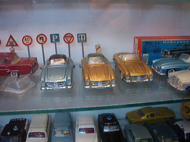 300SL mågevinge, og 180SL cabriolet samt en Mercedes formel racer “Sølv pil”