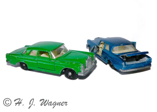 Den grønne og blå Mercedes 300 SE nr. 46c afløste i 1968. Denne model fortsatte ind i superfast serien. Skala 1:66 eller S