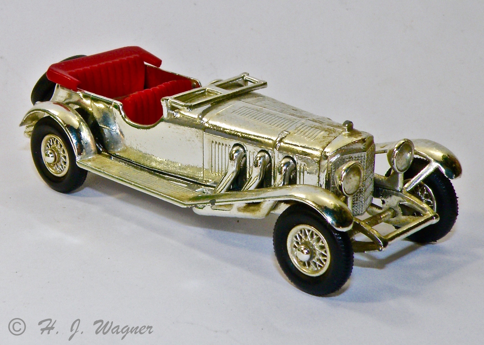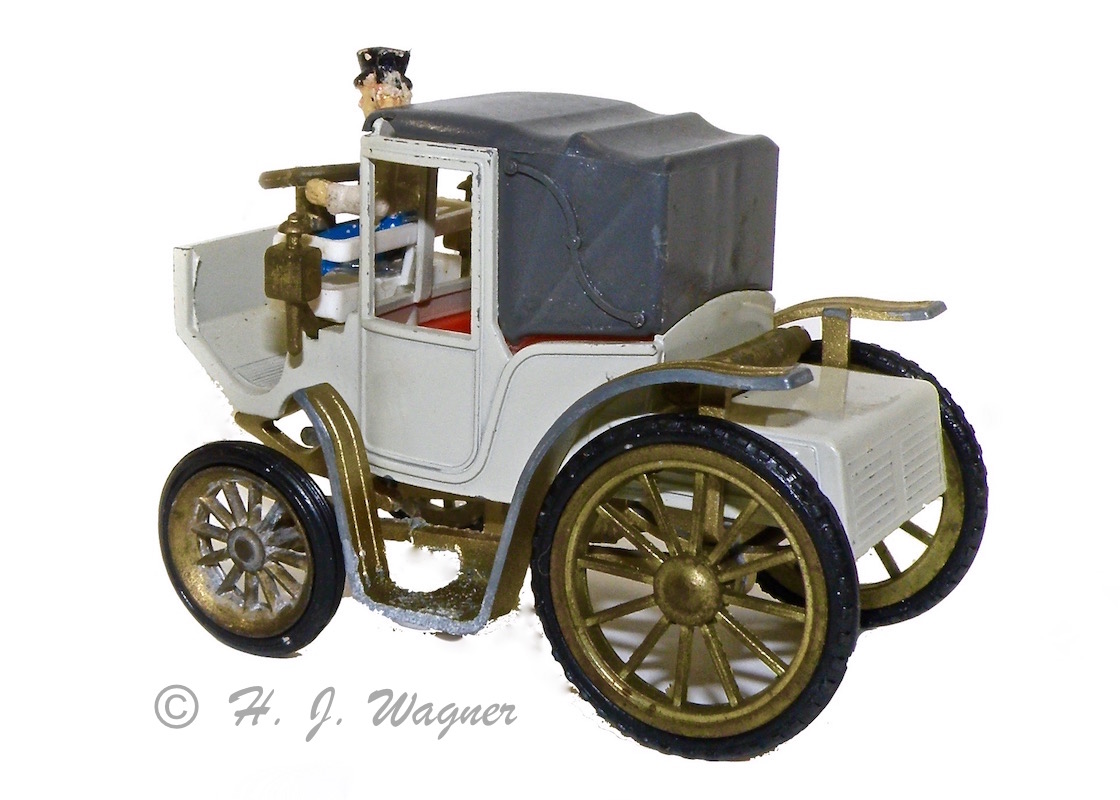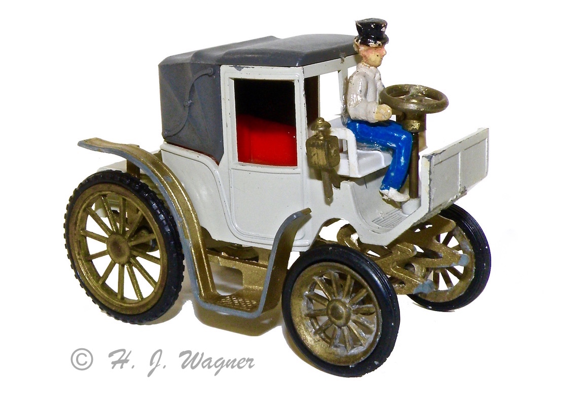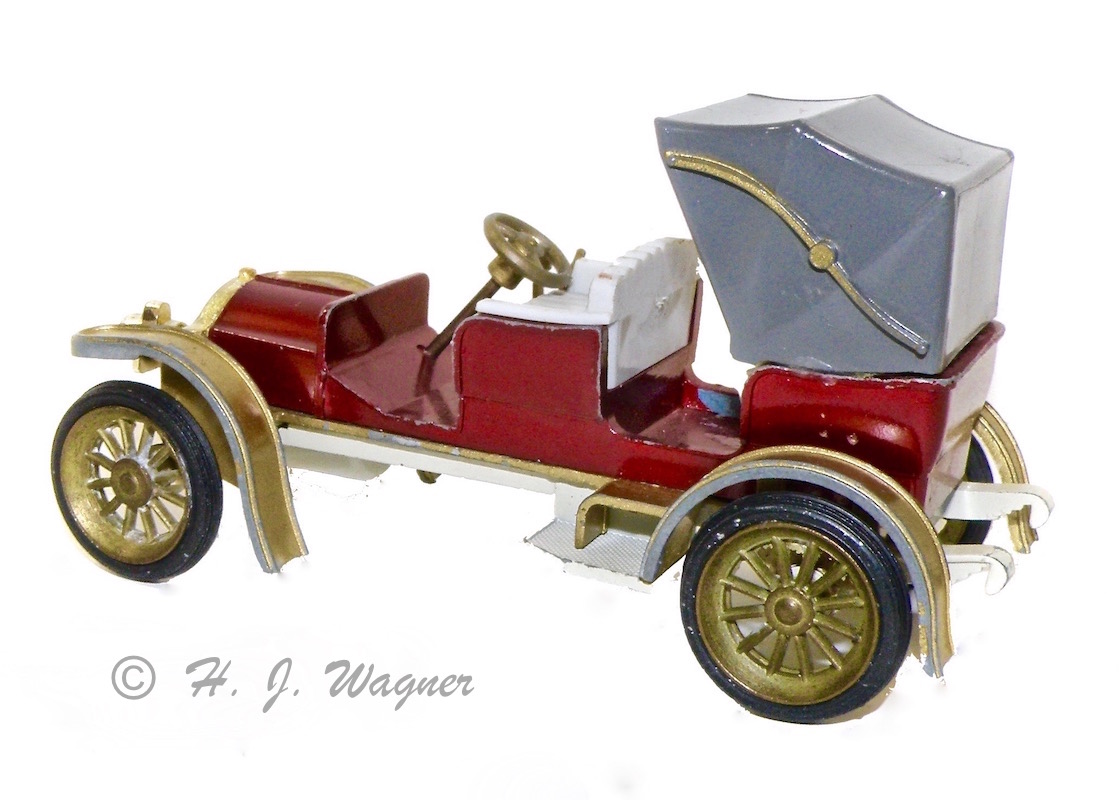 Modellen er fra GAMA Jeg har haft disse GAMA biler siden 1960´rne. Jeg har aldrig fundet ligheden med den virkelige bil, ikke rigtigt, men de er meget sjove. Denne er en af de sidste med plastik hjul. De fine forlygter er af bød plastik, og det er selve rattet også. Det er sansynligvis derfor disse ting har overlevet.Vis á Vis ! Den moderne version ville måske betegnes — Samtale vogn —