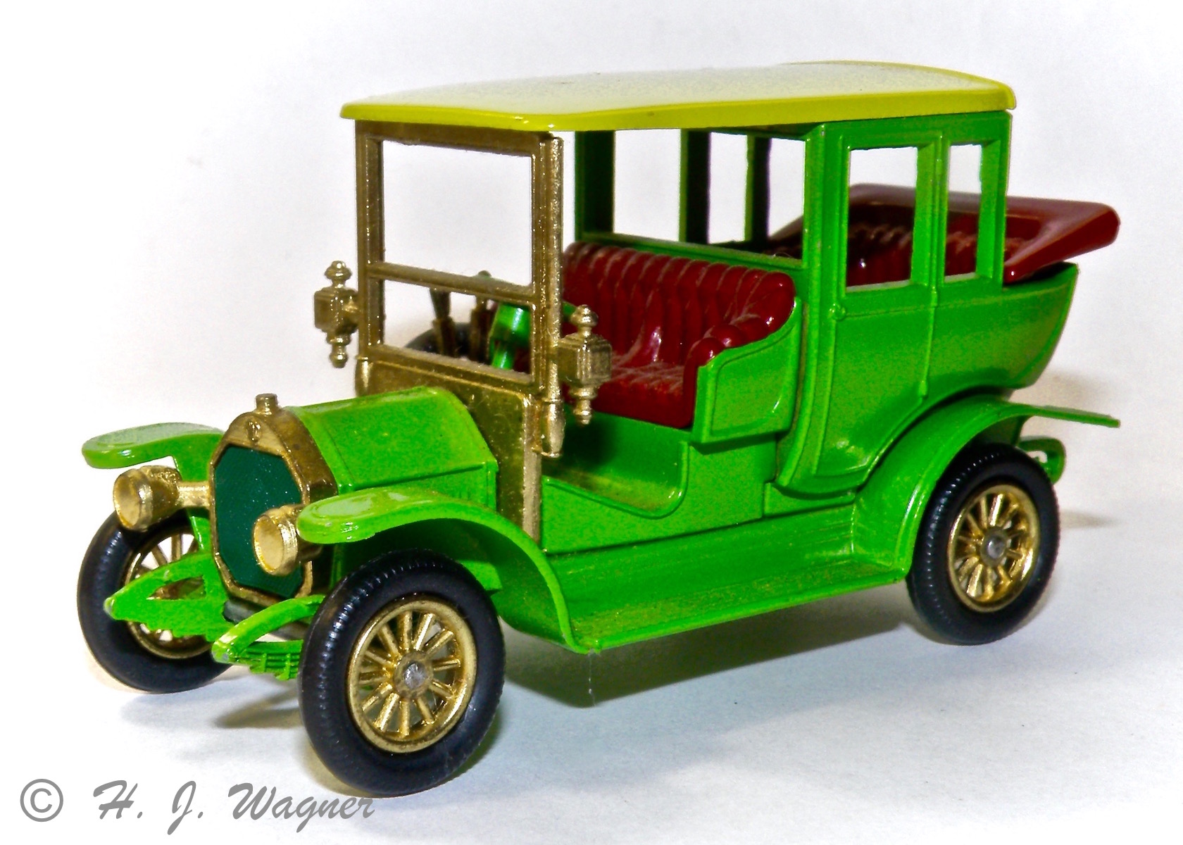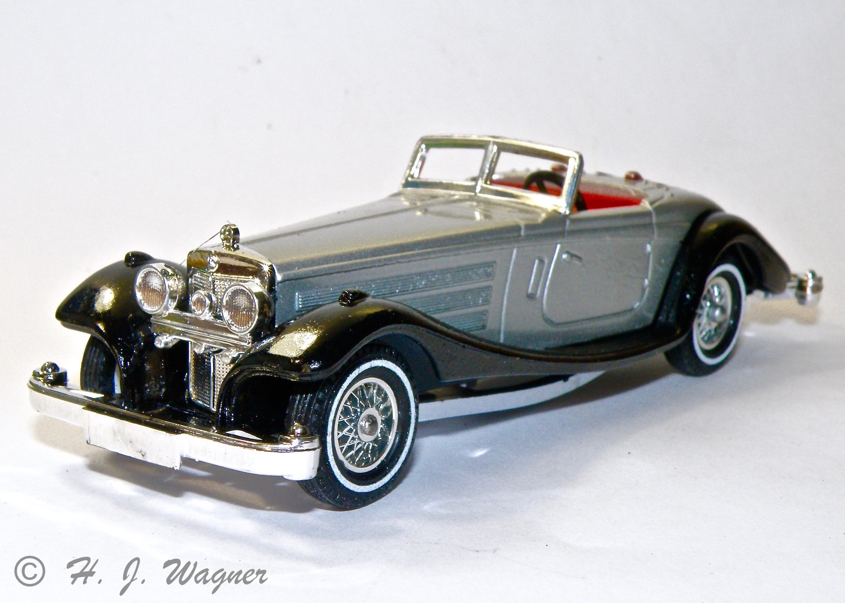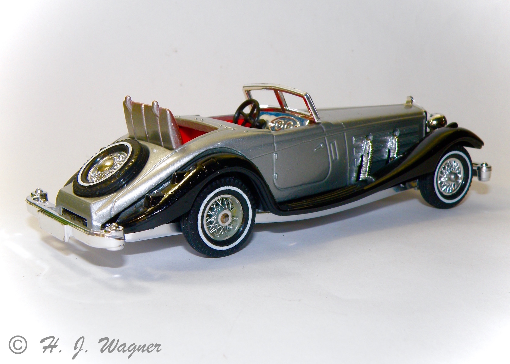 Modellen er fra GAMA Jeg har haft disse GAMA biler siden 1960´rne. Jeg har aldrig fundet ligheden med den virkelige bil, ikke rigtigt, men de er meget sjove. Denne er en af de sidste med plastik hjul. De fine forlygter er af bød plastik, og det er selve rattet også. Det er sansynligvis derfor disse ting har overlevet.Vis á Vis ! Den moderne version ville måske betegnes — Samtale vogn —