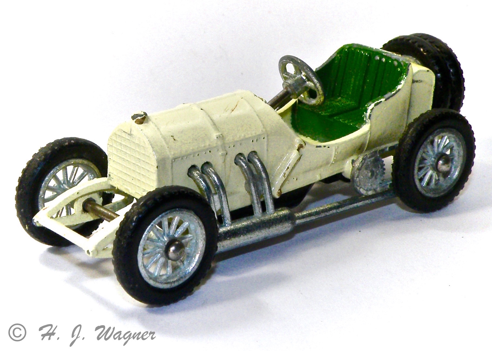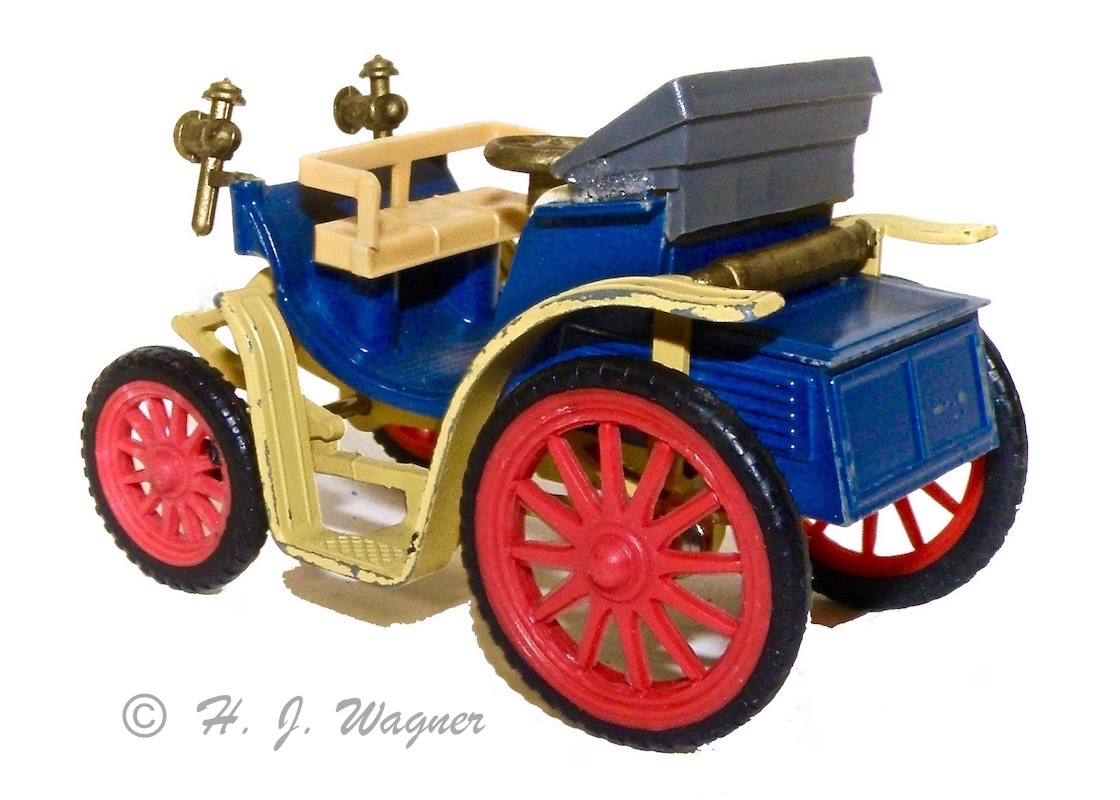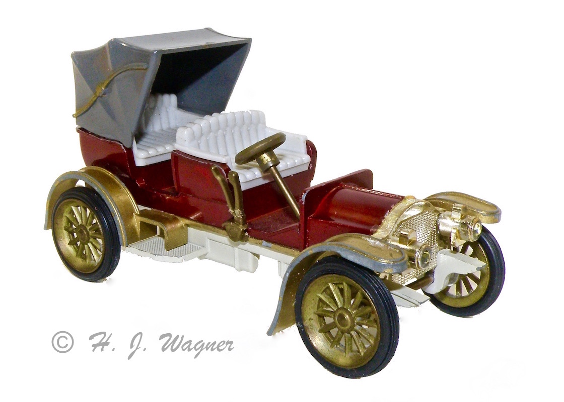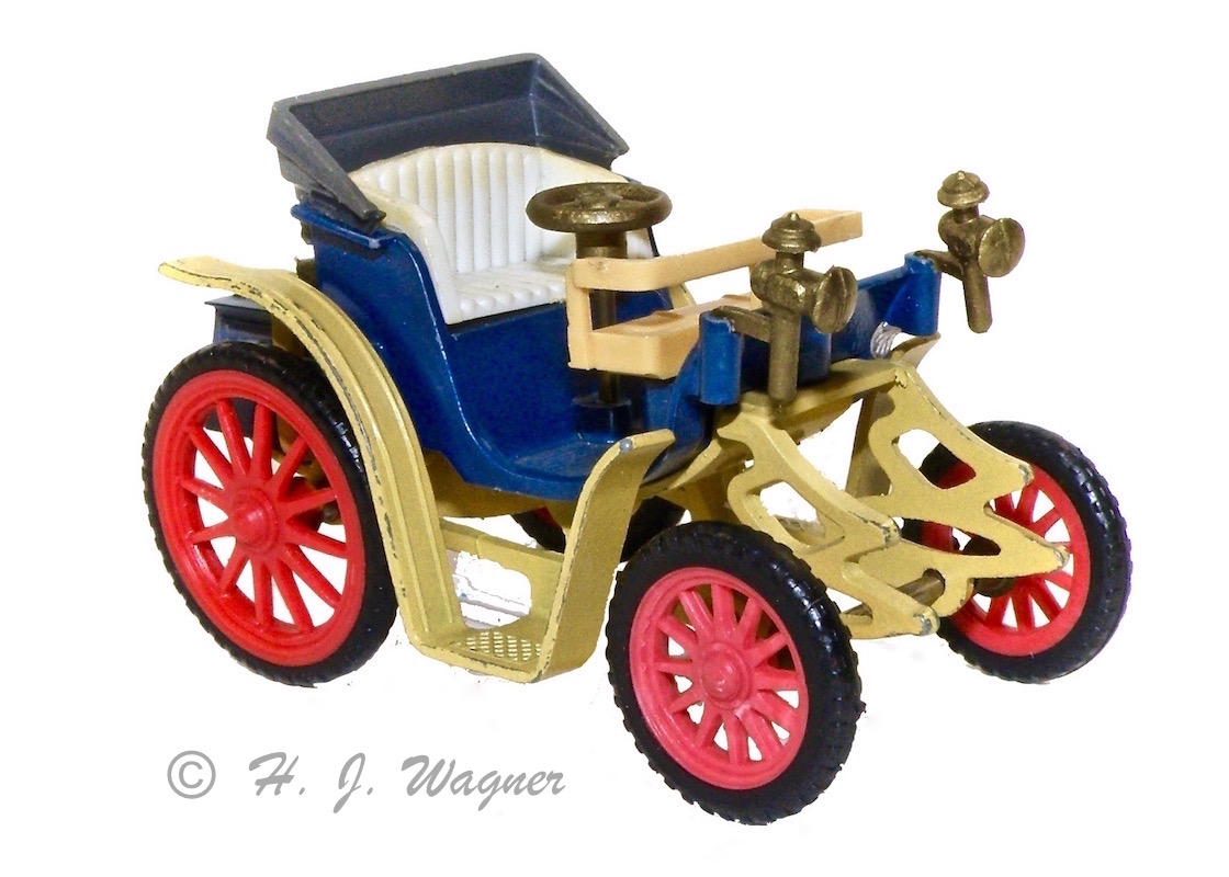 Participant1906 Benz fra Matchbox models of yesteryear — Denne model findes i flere farver men også med køleren monteret, på hovedet. Derved kan lygterne side højt eller lavt.