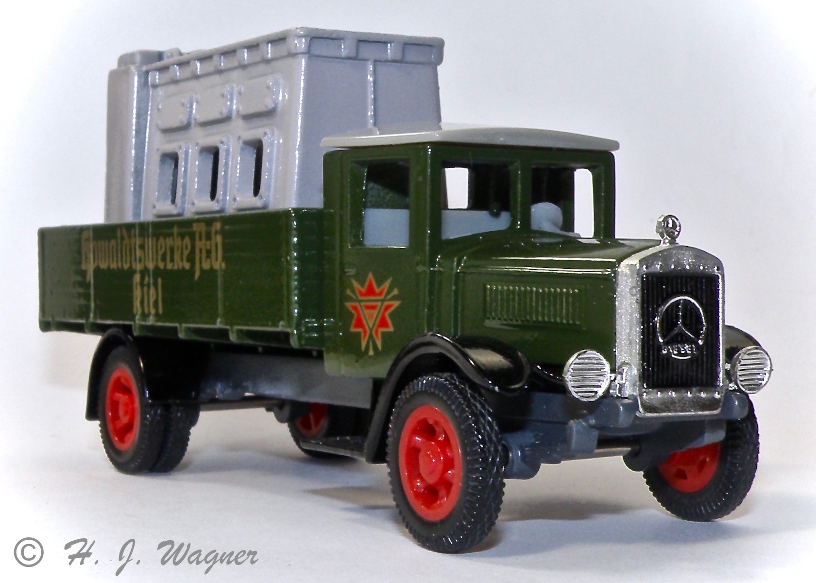 Participant1932 Mercedes-Benz L5 lastvogn fra Matchbox – models of yesteryear , med motor blok på ladet.