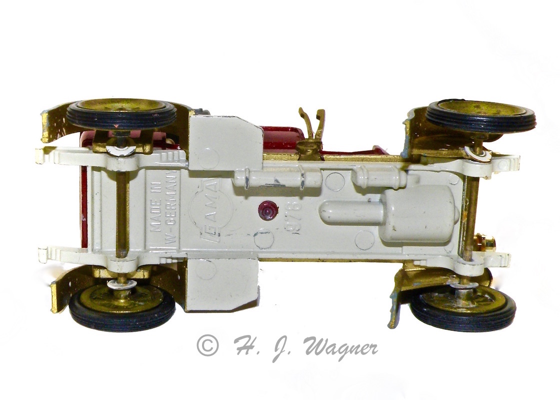 Denne er som den forgående skala 1:46. Jeg vil formode at min model er en af de tidlige GAMA veteraner fordi den har en chauffør. Søger man på nettet så har de fleste ikke ham siddende på agestolen. Han er limet grundigt godt fast, og er som lygter og rat, af meget blød plastik.
