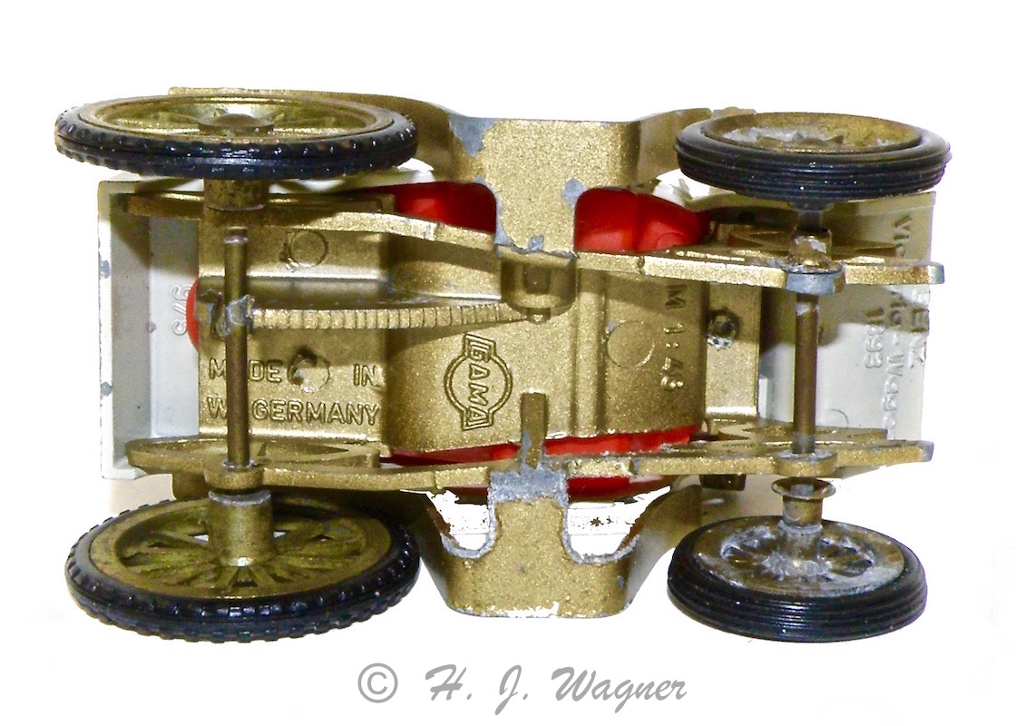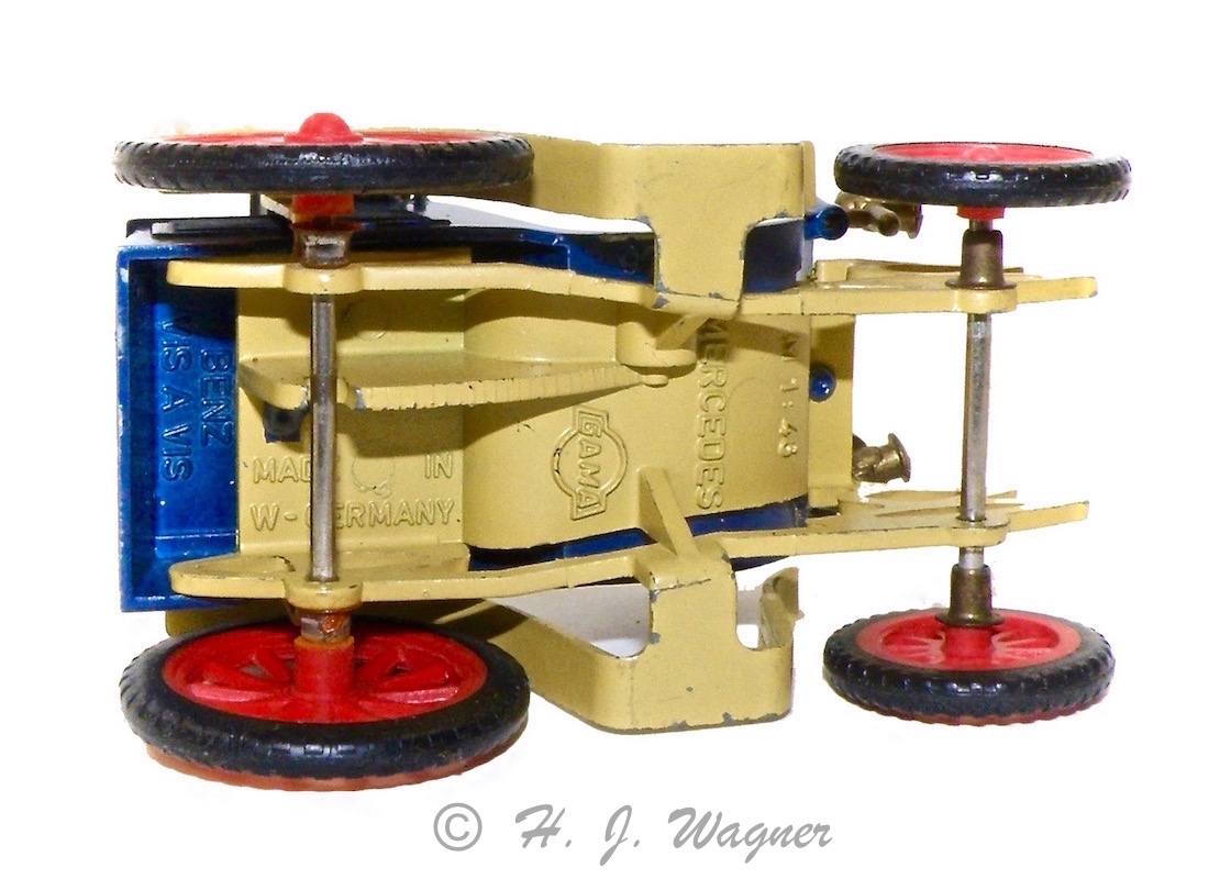 ParticipantBenz, Victoria Wagen årg. 1893 — Også en GAMA model men denne har metal hjul. Jeg vil skyde modellerne til at være fra 1964-66. Jeg vil tro at det også var der omkring GAMA tog veteranbiler ind i modelprogrammet, og jeg vil tro at de døde ud igen midt i 1970´rne. Jeg har ikke kunnet finde noget fornuftigt om den model. Det nærmeste var en større version en slaks bus, og en Taxi men den var meget anderledes end denne model. Jeg kan heller ikke finde andre legetøjs / model biler af disse Benz biler, så de er måske kun fra GAMA.