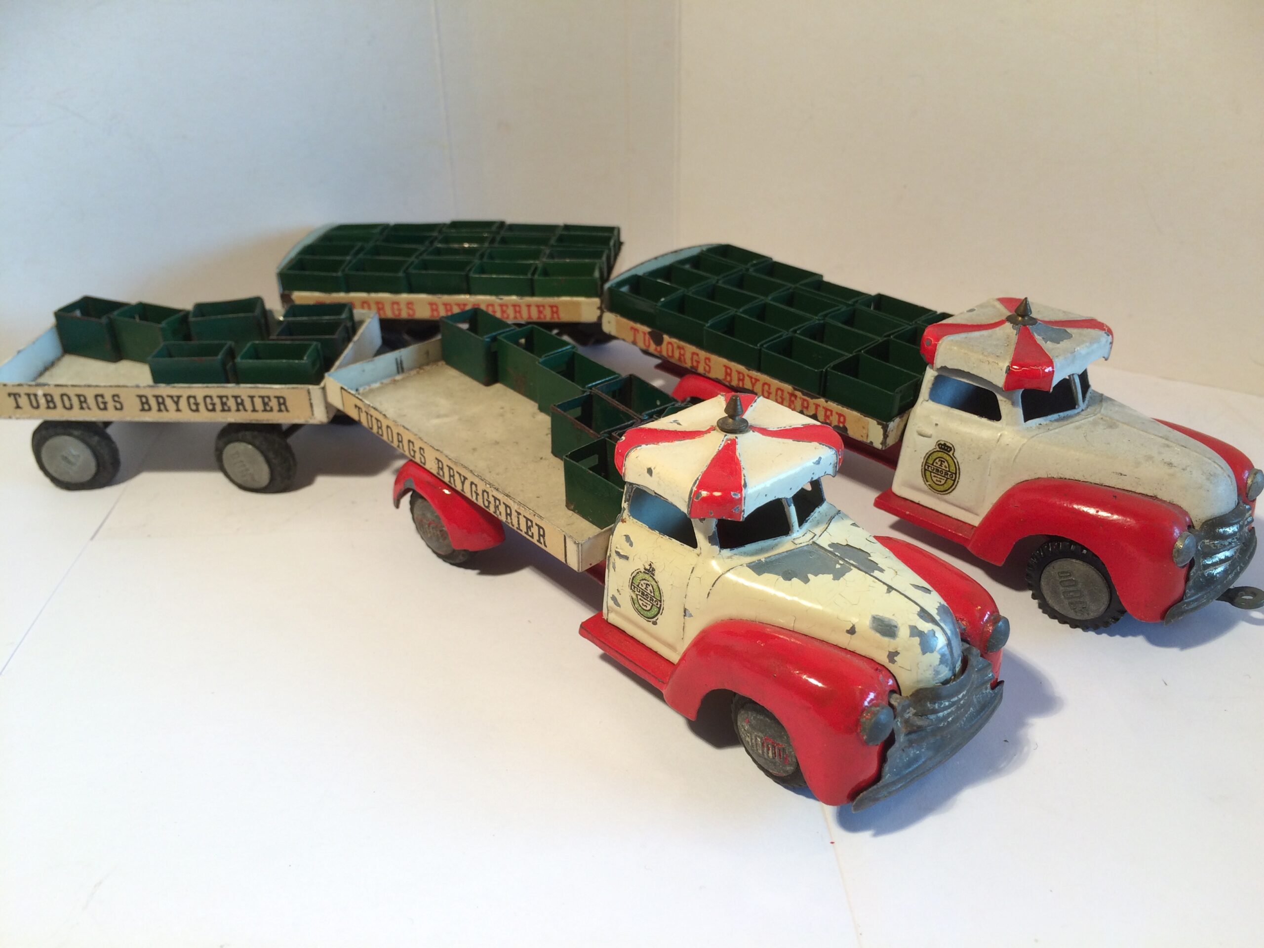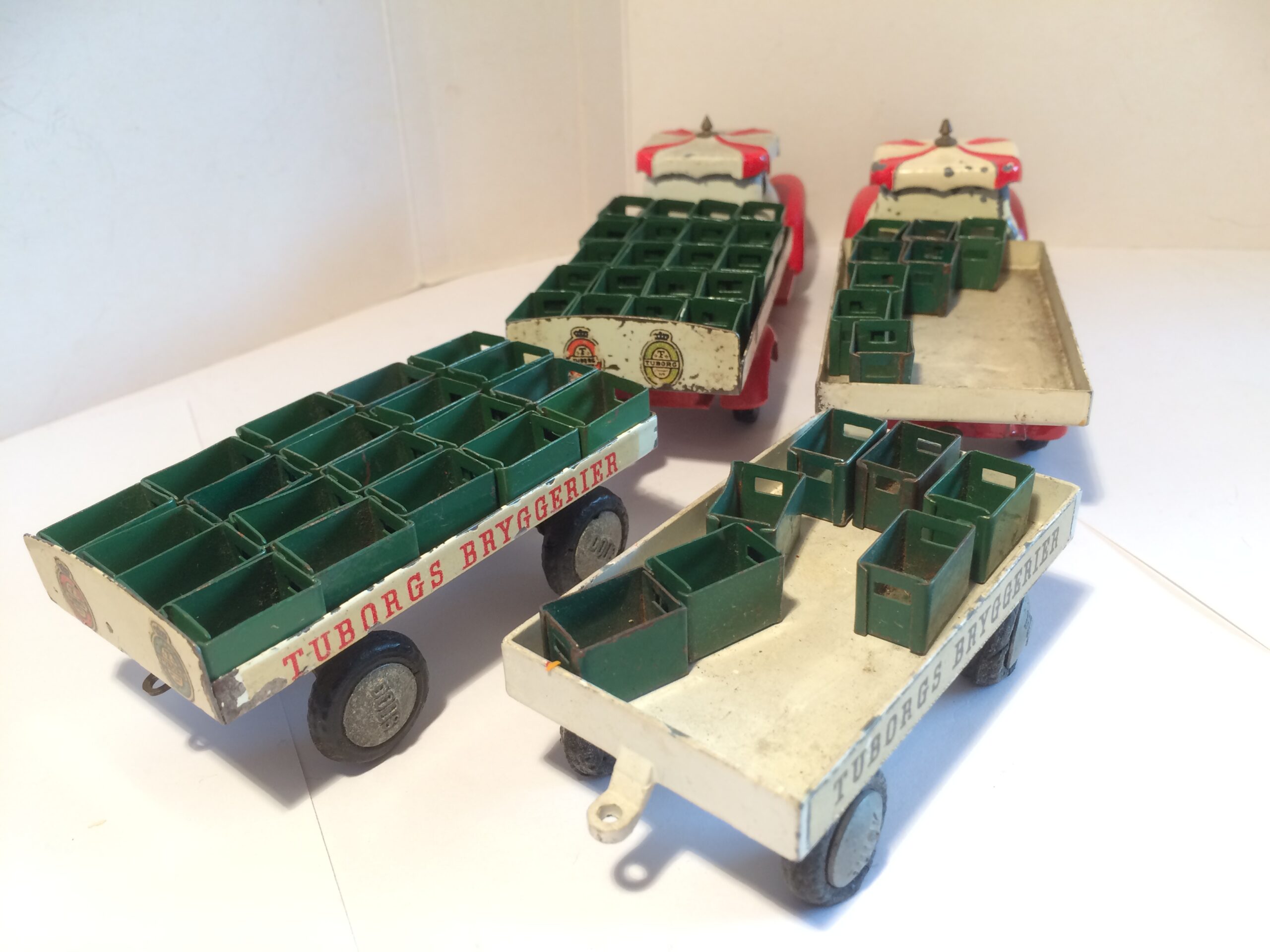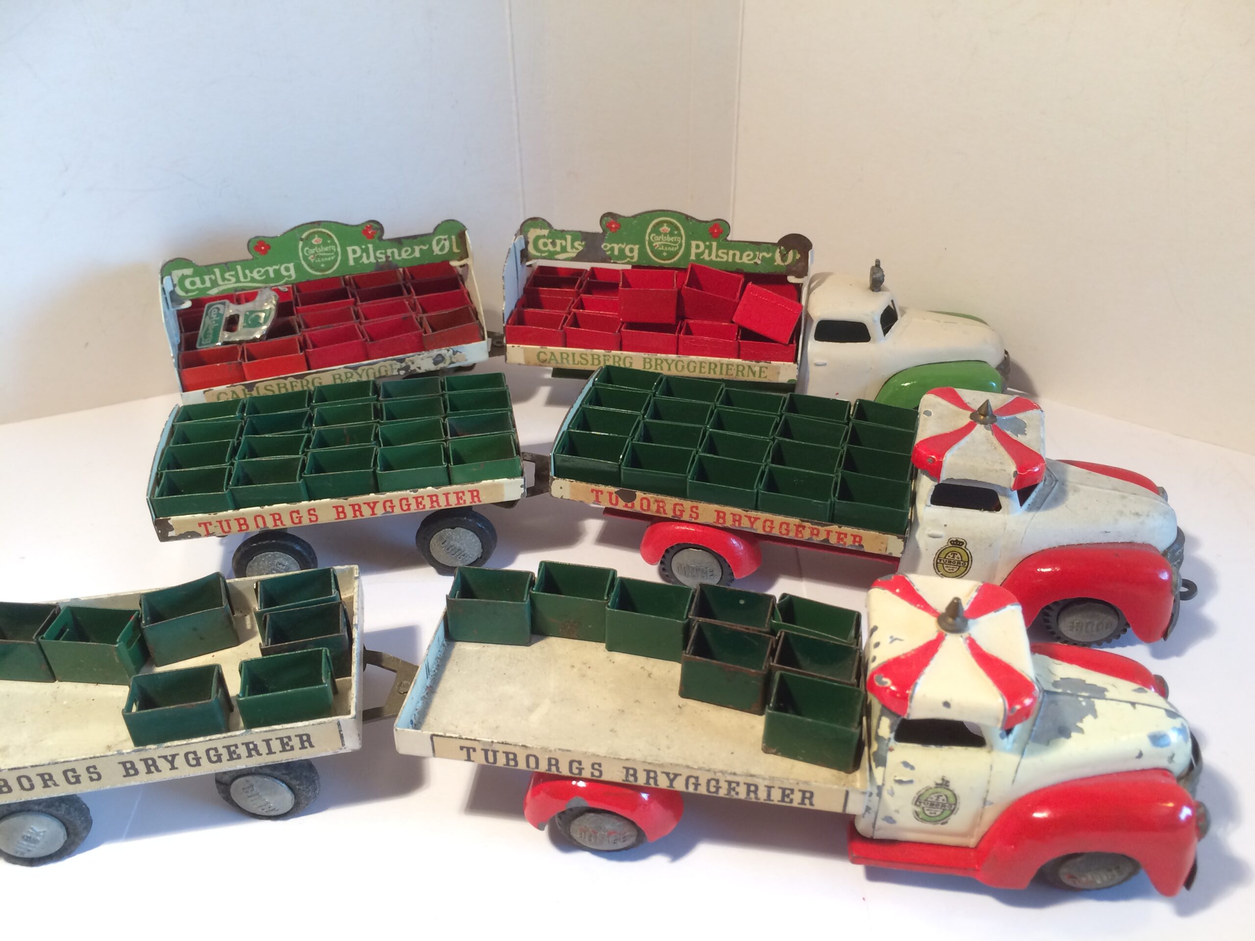 Nu har jeg to udgaver af Tuborg bilen den bagerste med rød skrift og “blik” trailer (plads til 20 kasser på hænger)og har høj bagsmæk på forvogn og hænger .Den med sort skrift med en “støbt” trailer ( plads til 16 kasser på hænger)og den med sort skrift har lav bagsmæk på forvogn og hænger alle er urestaureret kun Carlsberg bilen har på et tidspunkt fået plettet lidt på hytten - ForfatterIndlæg