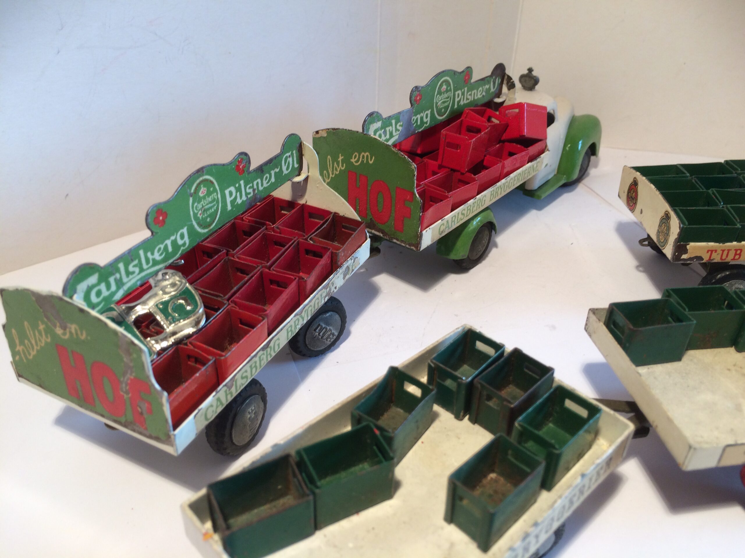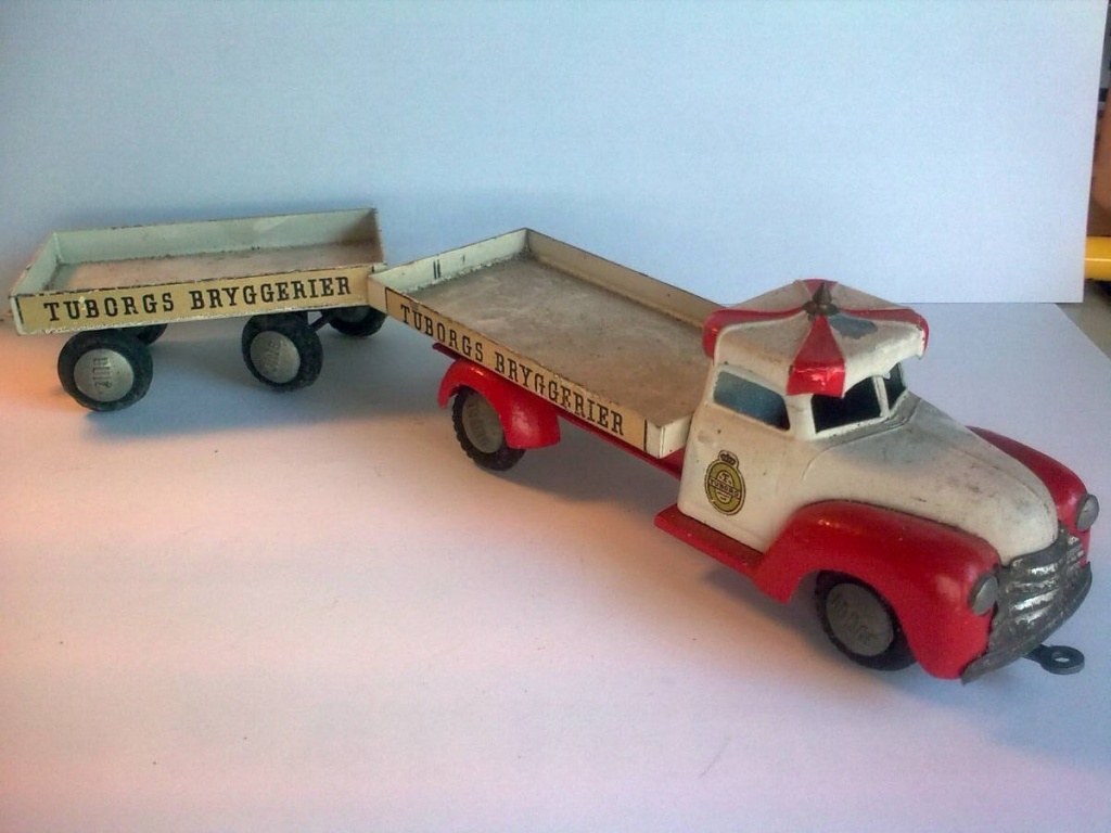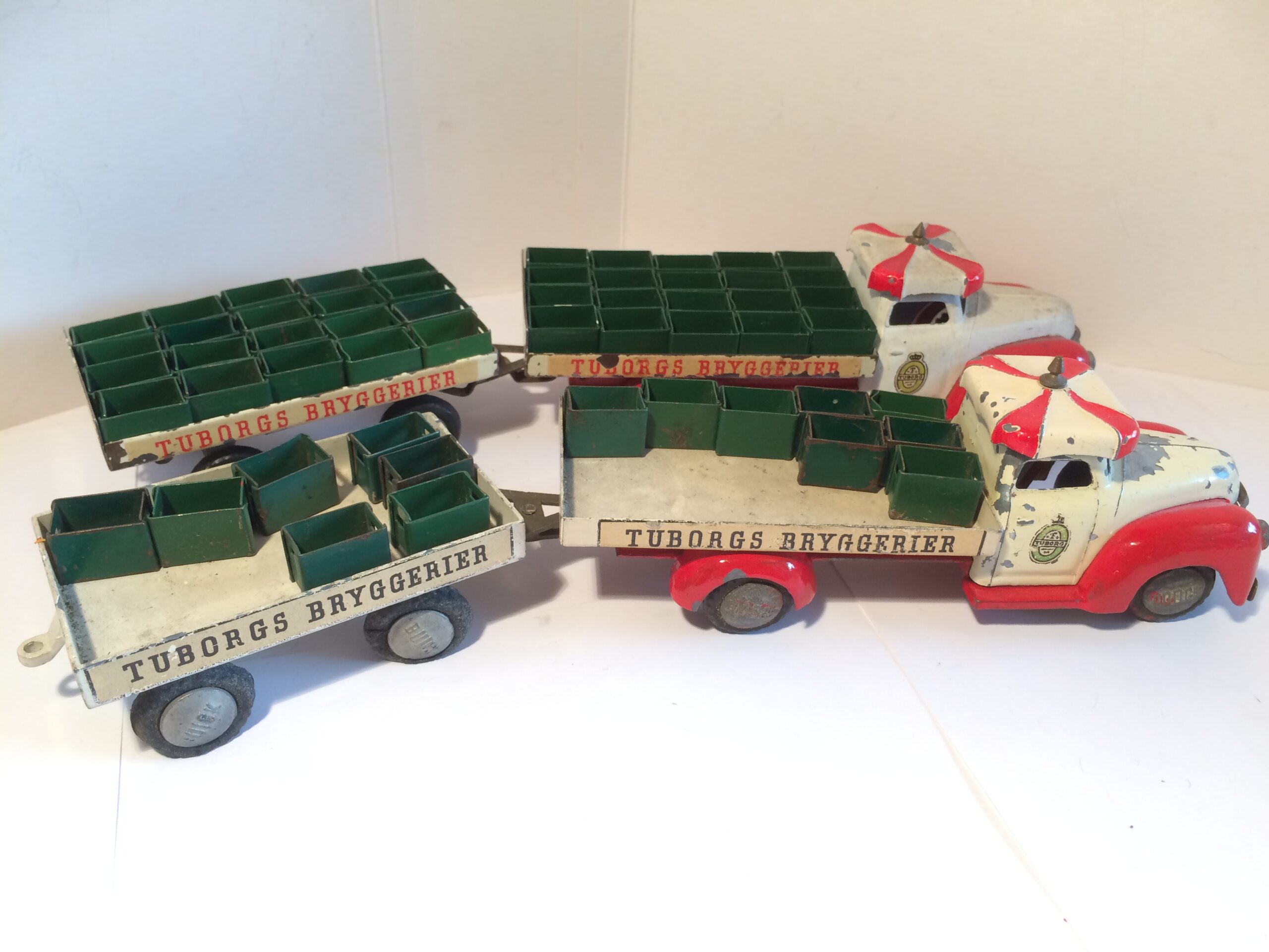 Nu har jeg to udgaver af Tuborg bilen den bagerste med rød skrift og “blik” trailer (plads til 20 kasser på hænger)og har høj bagsmæk på forvogn og hænger .Den med sort skrift med en “støbt” trailer ( plads til 16 kasser på hænger)og den med sort skrift har lav bagsmæk på forvogn og hænger alle er urestaureret kun Carlsberg bilen har på et tidspunkt fået plettet lidt på hytten - ForfatterIndlæg