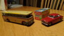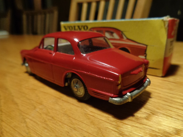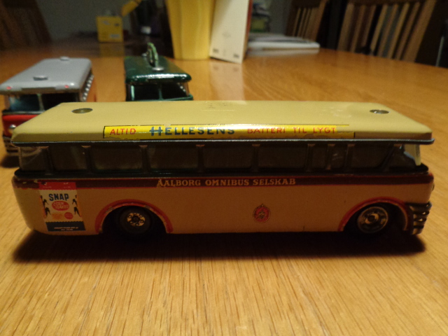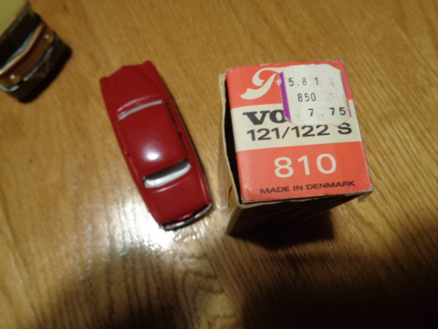 Der fandt jeg lige en rød 2 dørs Amazon med æske for 400 kr. og en Volvo Aalborg Omnibus, ligeledes 400 kr.Amazonen er modellen med Mustanghjul og uden Tekno-skilt i bunden og er som ny, æsken har lidt brugsspor, men der er sjovt nok stadig et prisskilt, og den oprindelige pris har været 7,75 kr. Der er også en lille rød plet som angiver farven, men der ud over er der også en grøn plet. Er der nogen her inde som ved hvad den betyder?