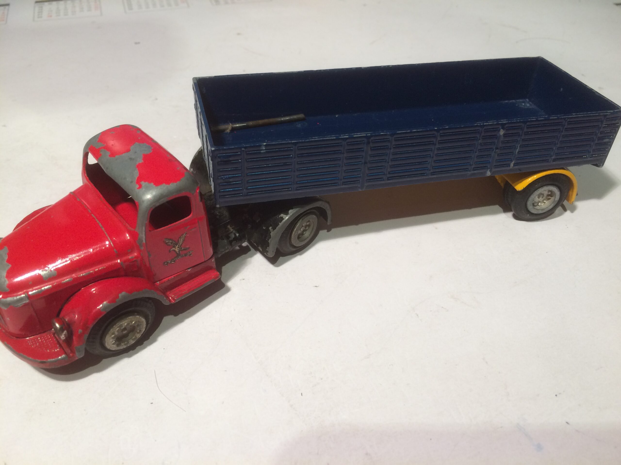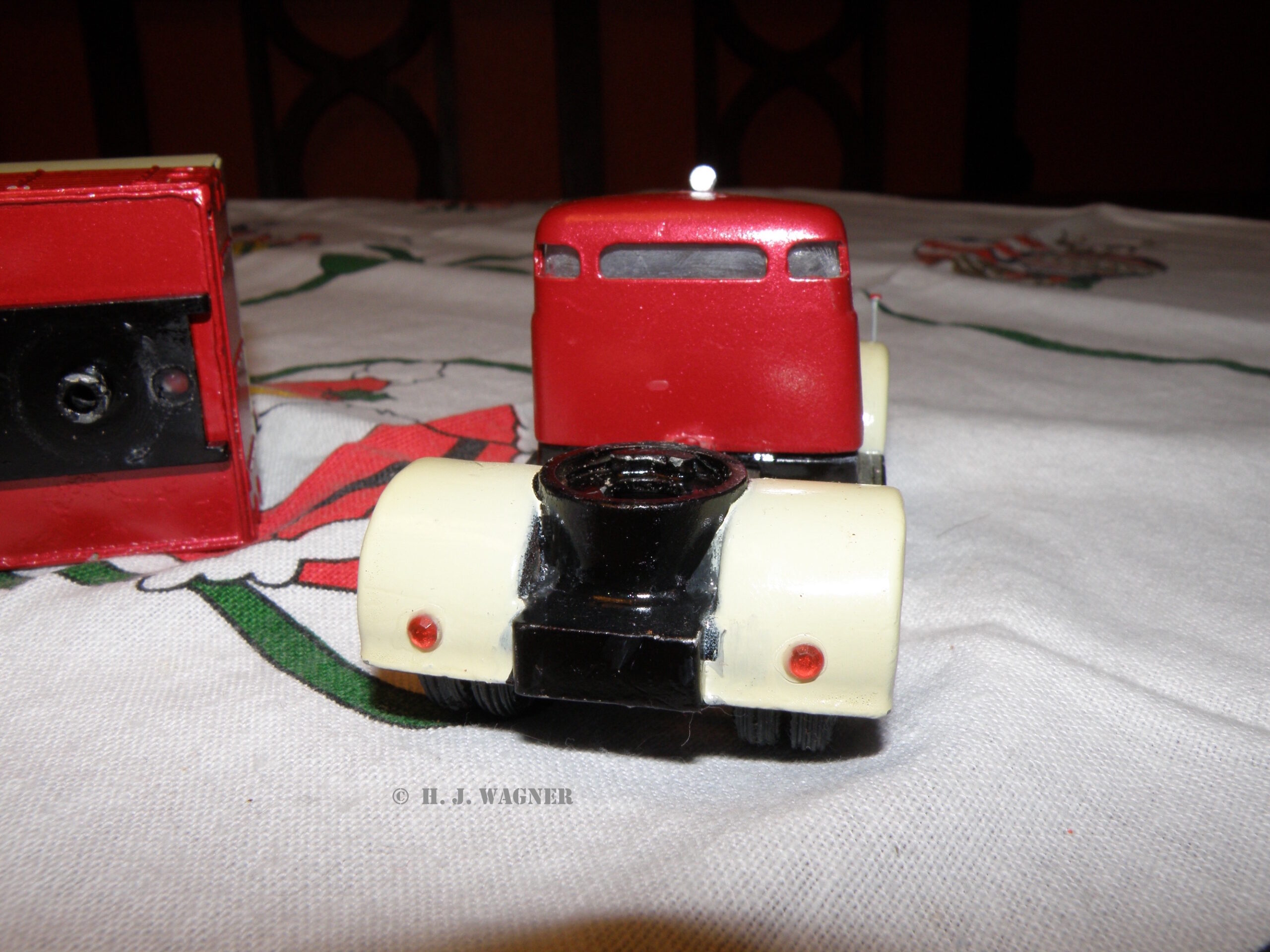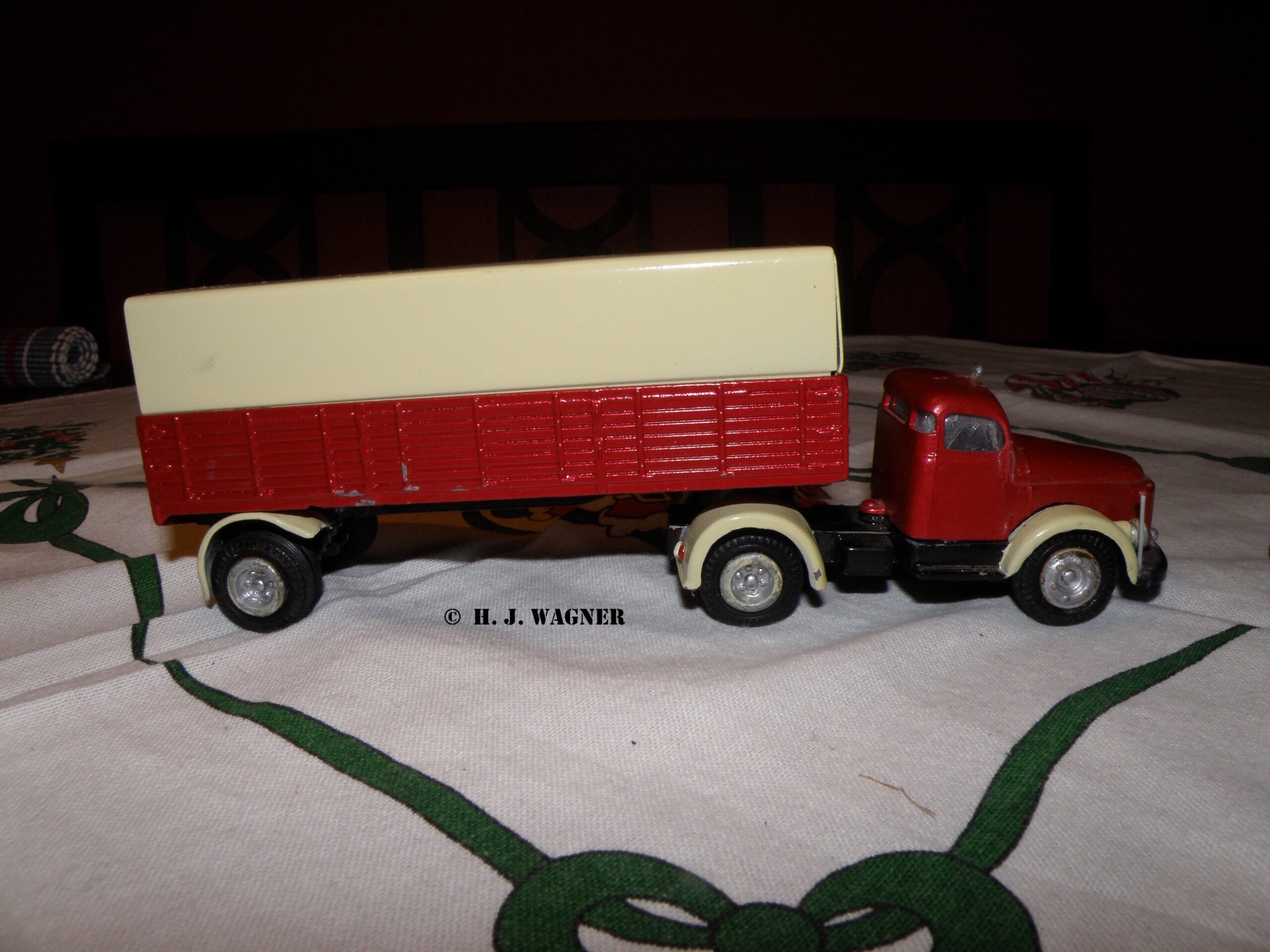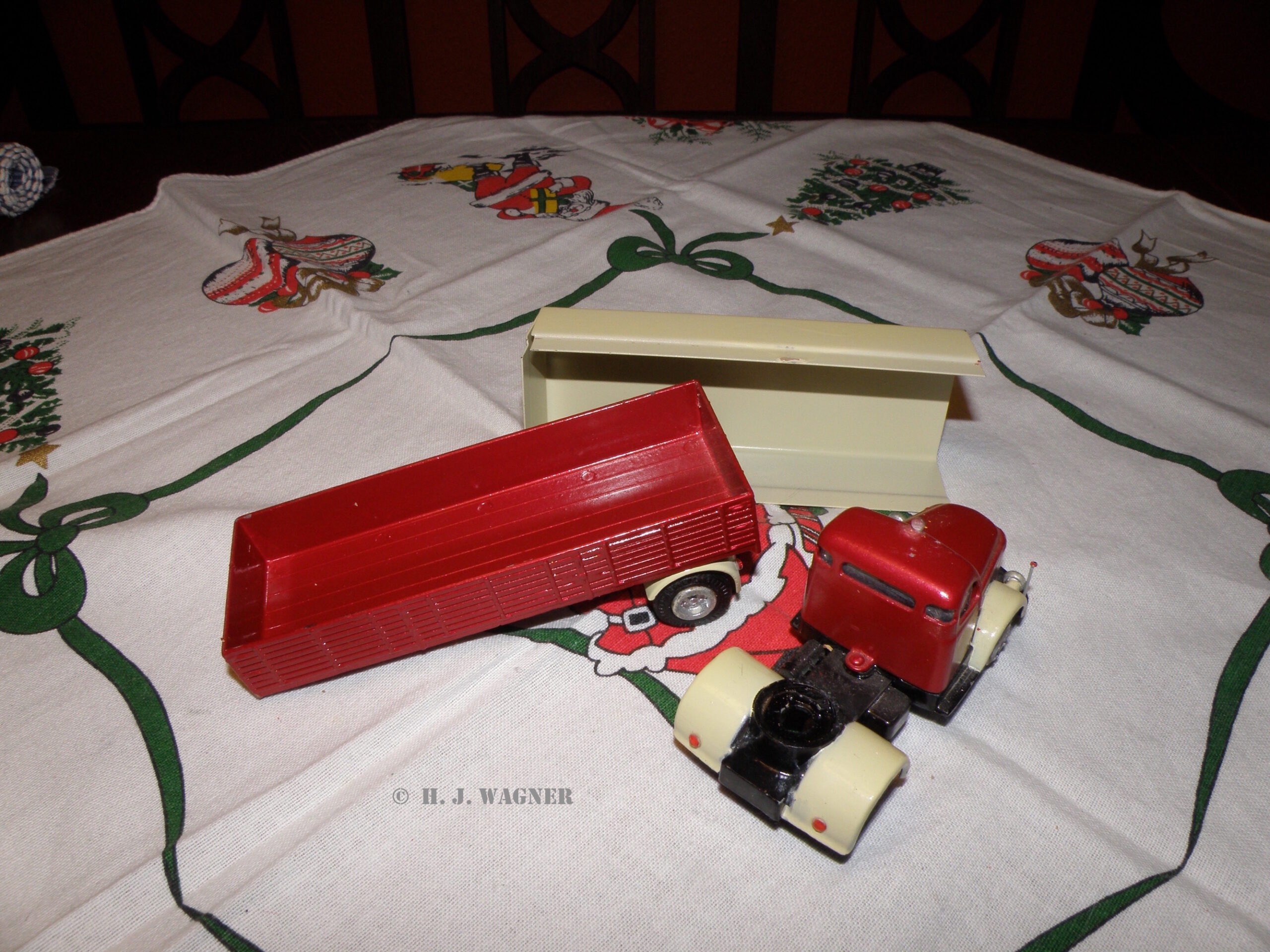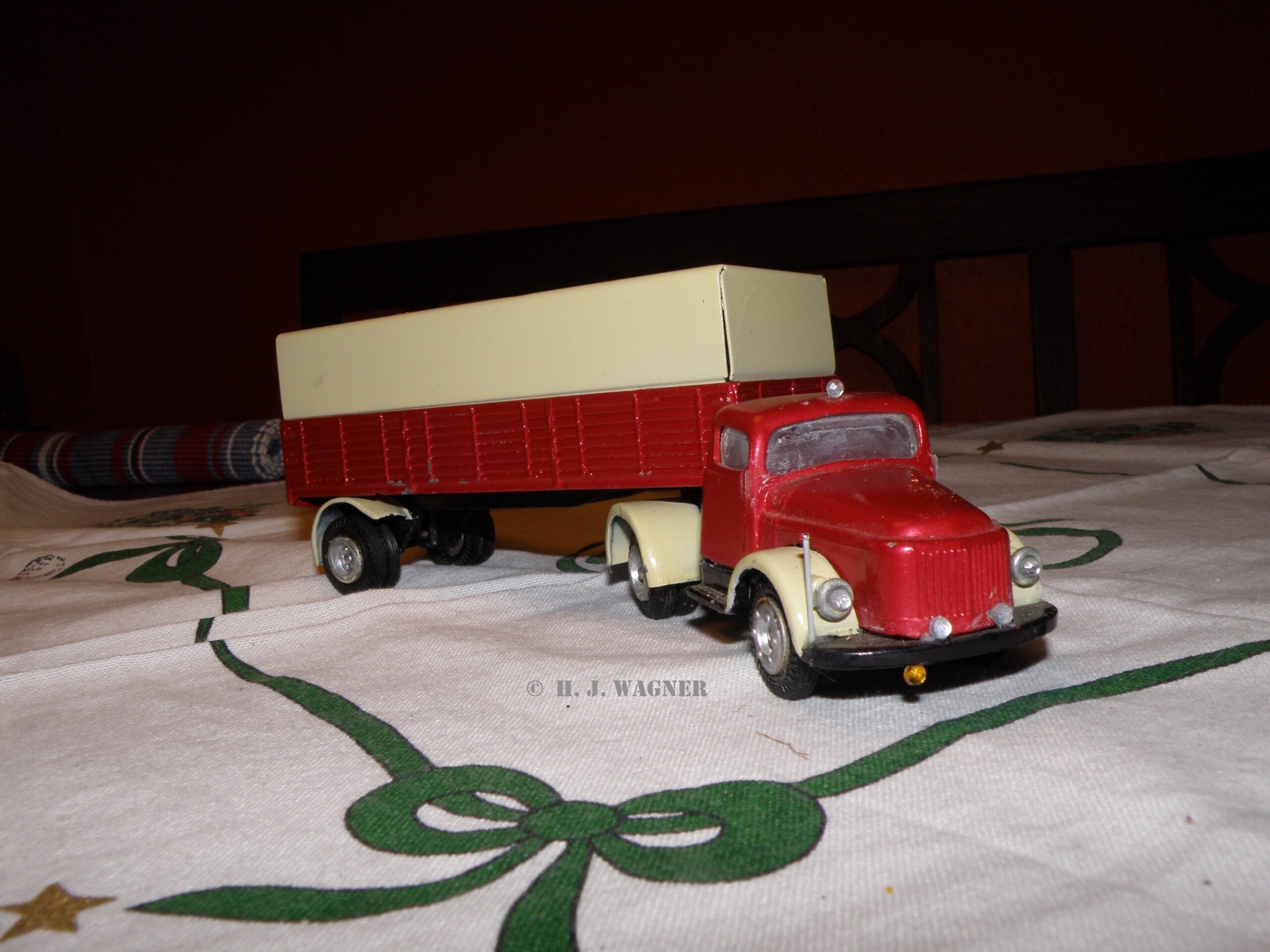 ParticipantHæ Hæ — Har sådan en. Min far´s kreasion fra 1966 — Grøn BP tankbil hvor tankdelen gik fra hinanden. Trailer fra flot rød langsnudet Scania, som min nye lillesøster fik finger i. Sådan nogen små finger kan splitte en fin ny Tekno lastbil ad i løbet af få minutter. Men det kunne sættes sammen til en Volvo sættebil. SÅ måtte jeg elz. plage i lang længere tid. Men det virkede, for plusli var der landet en råhvid Volvo med hænger, under juletræet. 😉