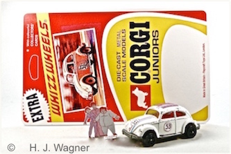 Det kan blive et meget interessant emne. Hvor langt kan man gå. Hvad er originalt og hvad er ikke originalt. Jeg har en Code 3 VW Herbie model. En ikke renoveret Corgi Juniors. Den har et pap til blistpack, og bilen har fået klistermærker, på Corgi maner´. Den er således helt original, dog ombygget, og nærmest Scratchbuild på samme tid.