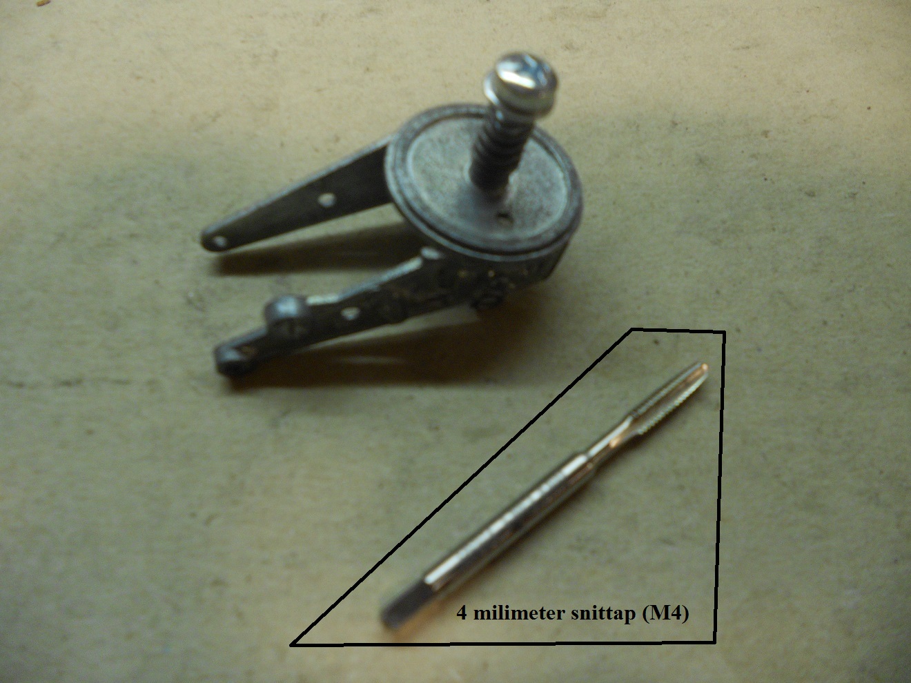 Jeg har med held skåret et gevind i stigekonsollet mener ca 4mm og der efter brugt fjederen og tilført en skive og en 4mm maskineskrue skruet den sammen. Samlingen er jo inde i bilen så den lille skrue betyder ingen ting. (Ikke i min verden)