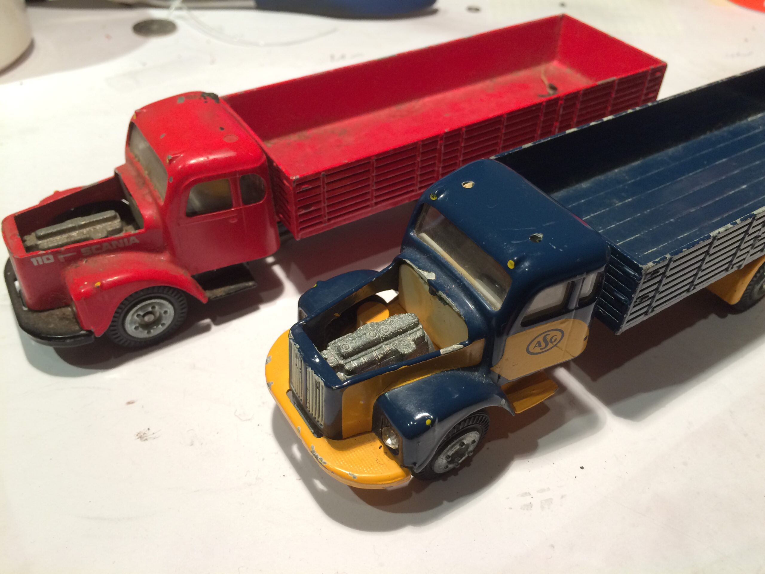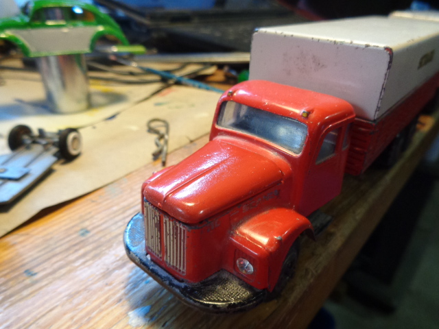 I mens jeg havde VW karosse til tøring, fik jeg lige tid til at lave lidt nænsom renovering på min røde Scania 110 som jeg har harft fra ny, købt ved en Legetøjsforretning i Lyngby for 39,50 kr. 15-10-1969, med andre ord på min 8 års fødselsdag. Jeg fik nemlig 40 kr. af min Mormor, og så stod jeg meget hurtigt inde ved Legetøjsforretningen.