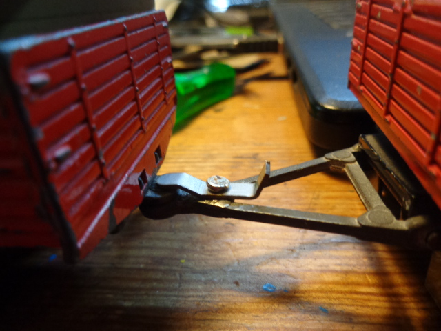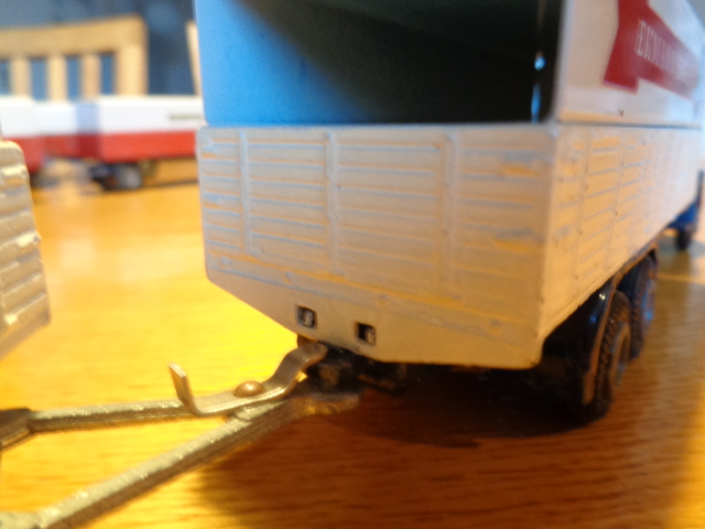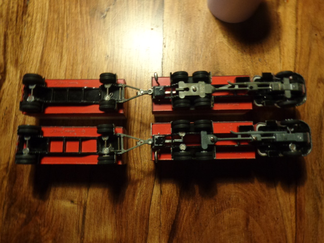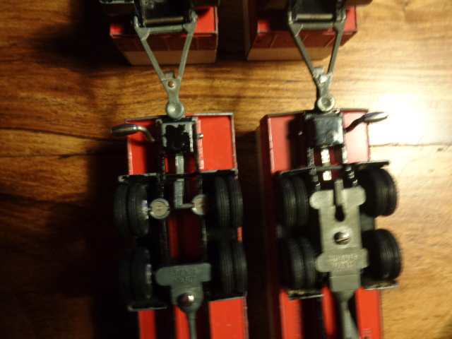 Her under har jeg gjordt det samme med mine 2. Jeg har nemlig en rød mere i en ældre udgave. Og jeg kan se at den er som din den røde. Til gængæld er den jeg har fra 1969 med den nye bund som din den blå/gule, men min har håndtaget til bogie i højre side, hvor jeg kan se at alle øvrige har dette håndtag i venstre side. Så det må være en ændring der er sket efter man skiftede til nye dele i bunden.Derfor uden kan jeg se at man også har forstærket bunden på anhængeren på et tidspunkt.
