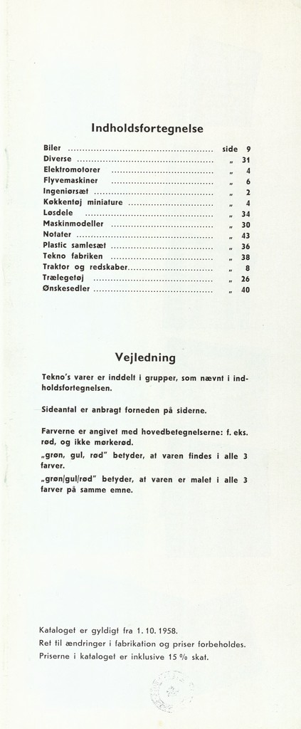 Kataloget fra 1958 kan man finde med samme søgning på Det kongelige Biliotek. Heraf fremgår det tydeligt, hvor mange bilmodeller Tekno efterhånden har fået fremstillet. Sidst i kataloget er der en fin redegørelse for fremstilling af modellerne.