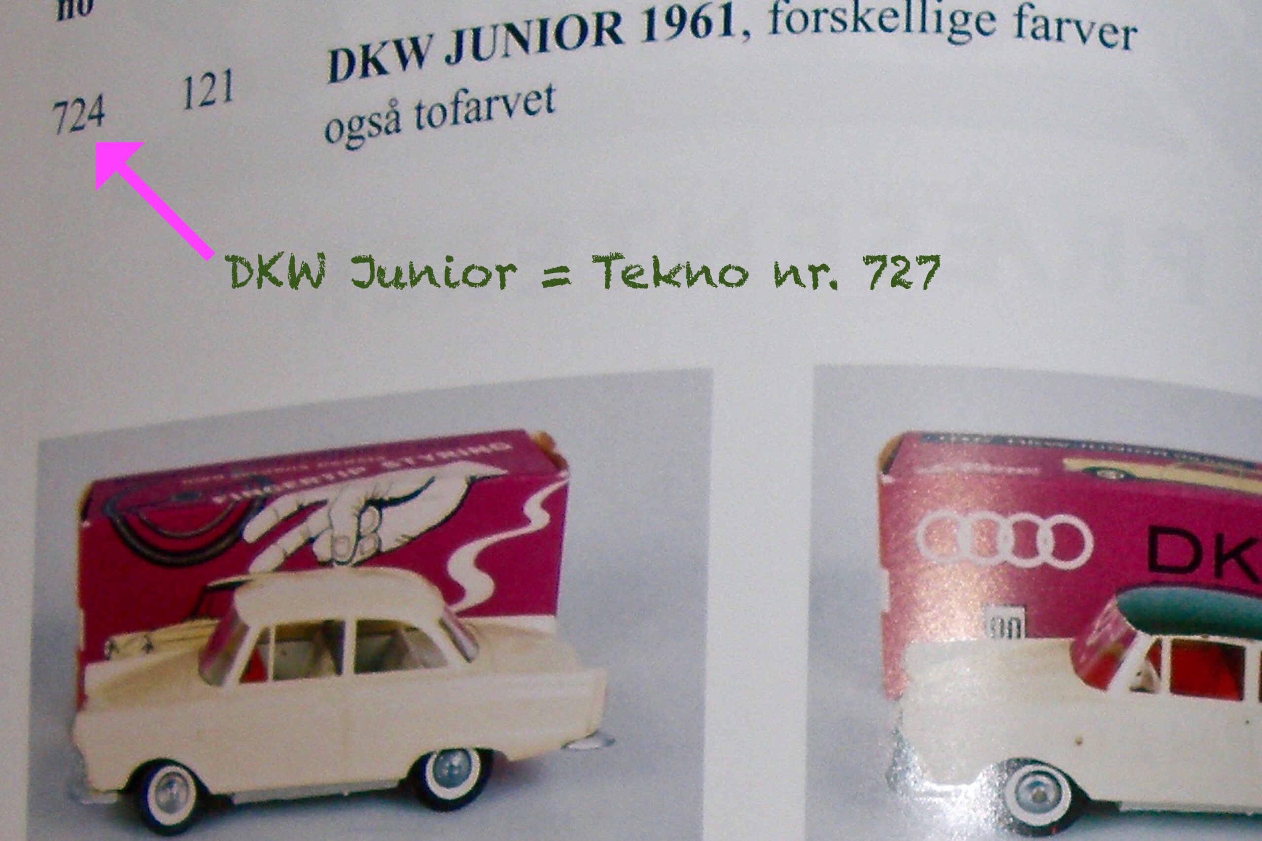 I 1984 havde man korekt angivet Opel KAdett med nr. 724, og DKW Junior med nr. 727