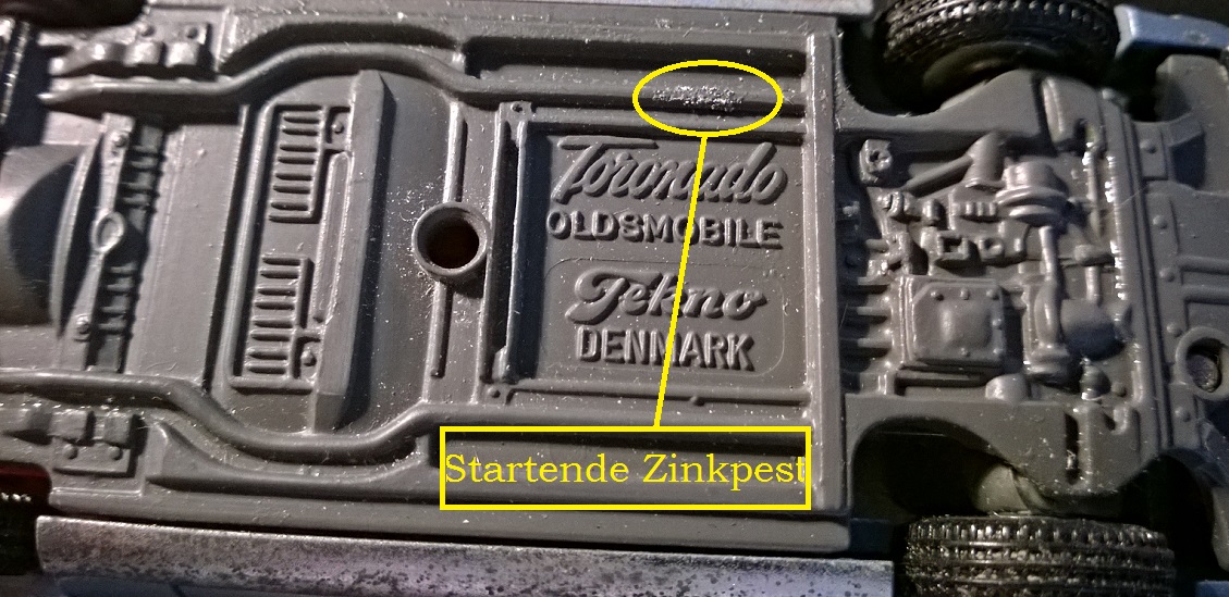Det er en meget lille skade… Men den ser desvære ud som om den kommer inde fra… Jeg ville skille bilen ad og se hvordan bunden ellers ser ud indv.. Er der skader indv… Ser det ud som om der er begyndende krakeleringer indv. hvor der ikke er malet, så må bunden ud desvære…. Ellers ville jeg børste af med en tandbørste og give stedet noget Gunoli, og også indv. på bunden for at lukke af for ilt tilgang… Man kan begynde med svovlsyre og udvanding osv. men det ville jeg ikke begynde på, så hellere stille og roligt lede efter en ny bund…Har bunden skader indv, så skal den aldrig på igen.. Det smiter nemlig. Havde en lille brand bil fra Matchbox men pest i karrossen. Det havde smittet til bunden ved det ene baghjul…Har en fin som ny 55 år gammel Märklin togvogn… Den måtte have nye hjul, da de gamle hjul havde zink-pest i alle stadier fra hvid overflade til begyndende krakeleringer til noget man kunne knække mellem fingerne.. Har evt. skrevet lidt om det på min side.