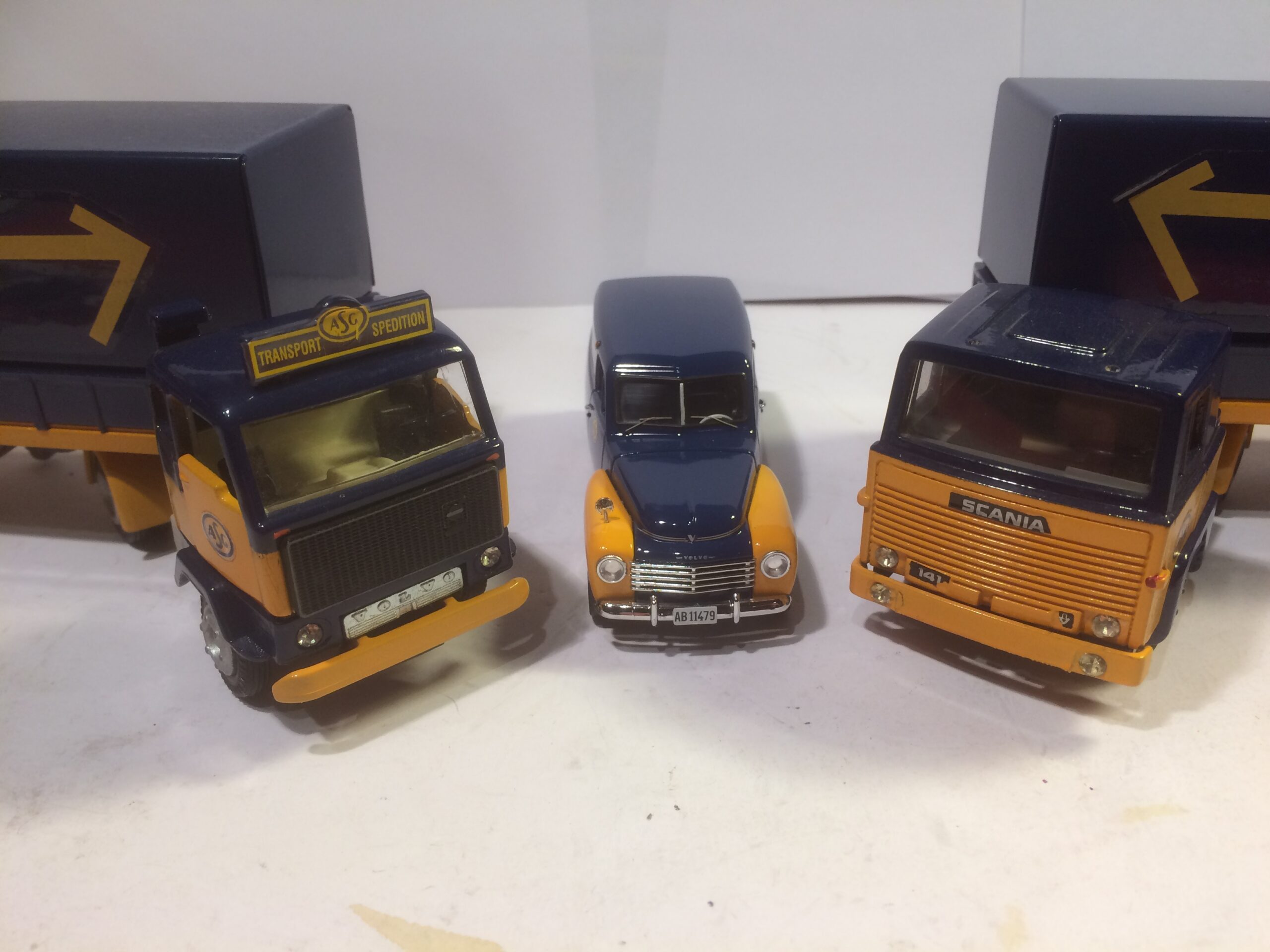 Billeder af Tekno NL Scania 143M med trailer i Nords brune farve på Tradera og blå Volvo på samme side. Også mine Tekno ASG Scania’er.
