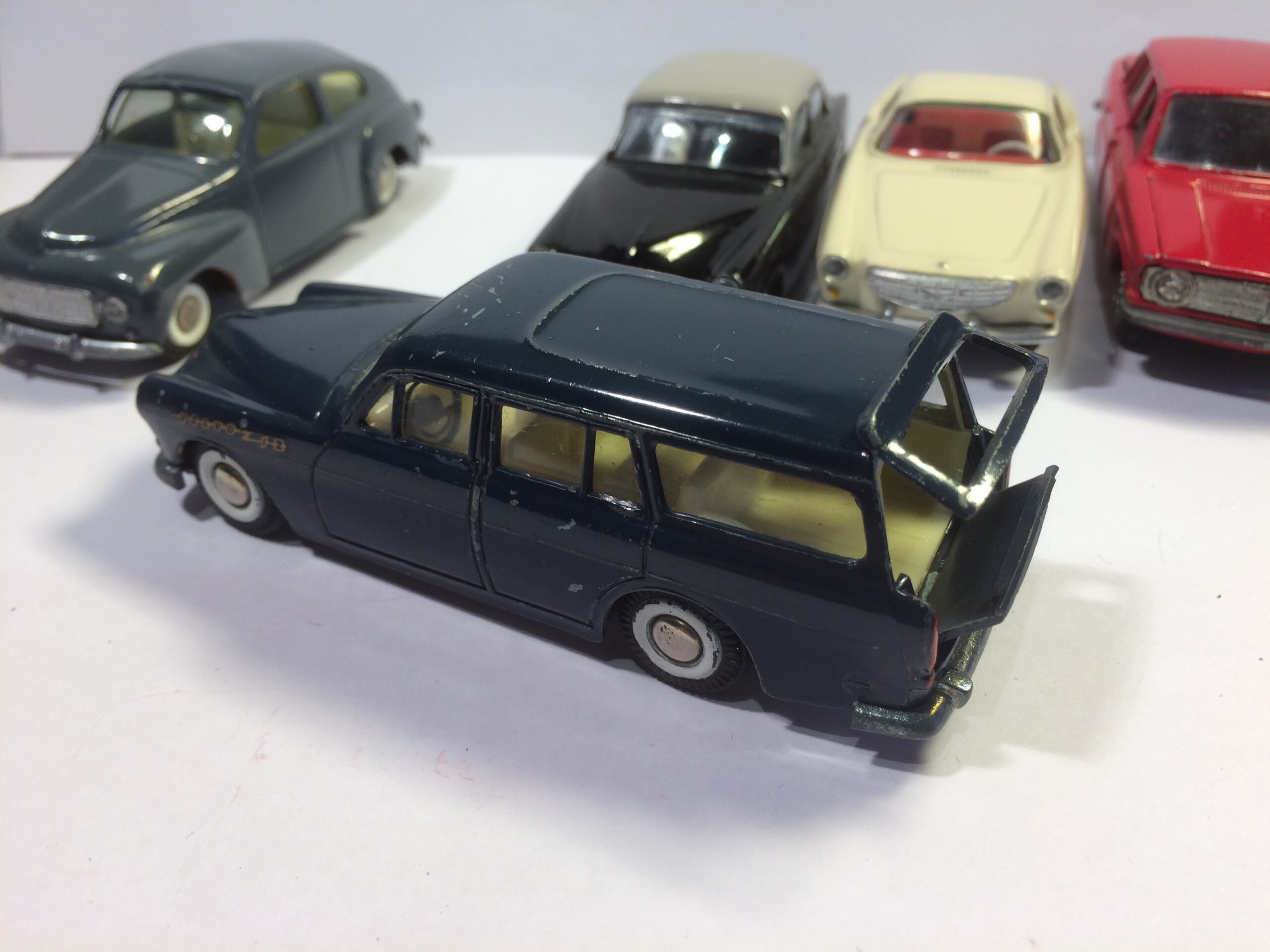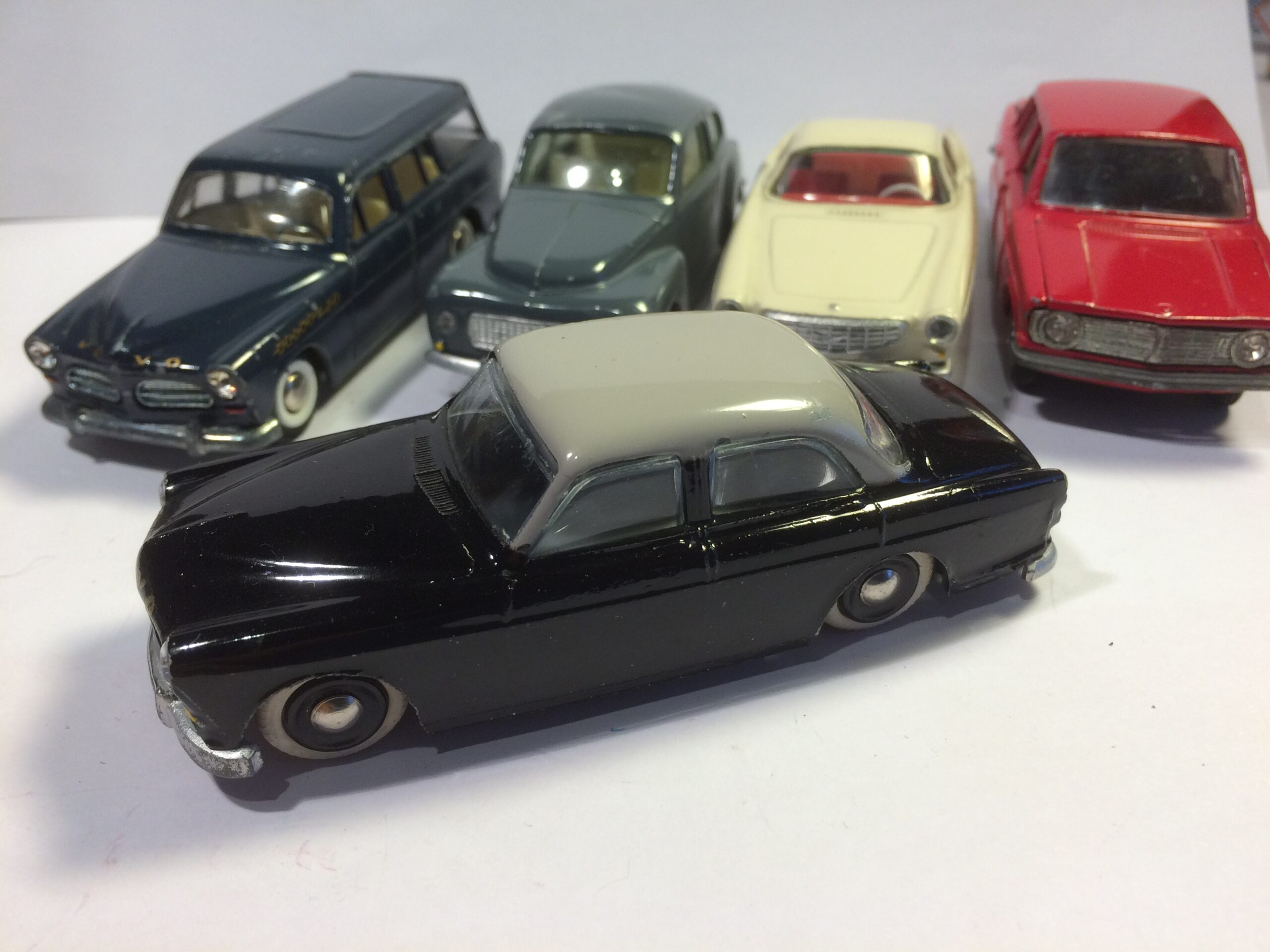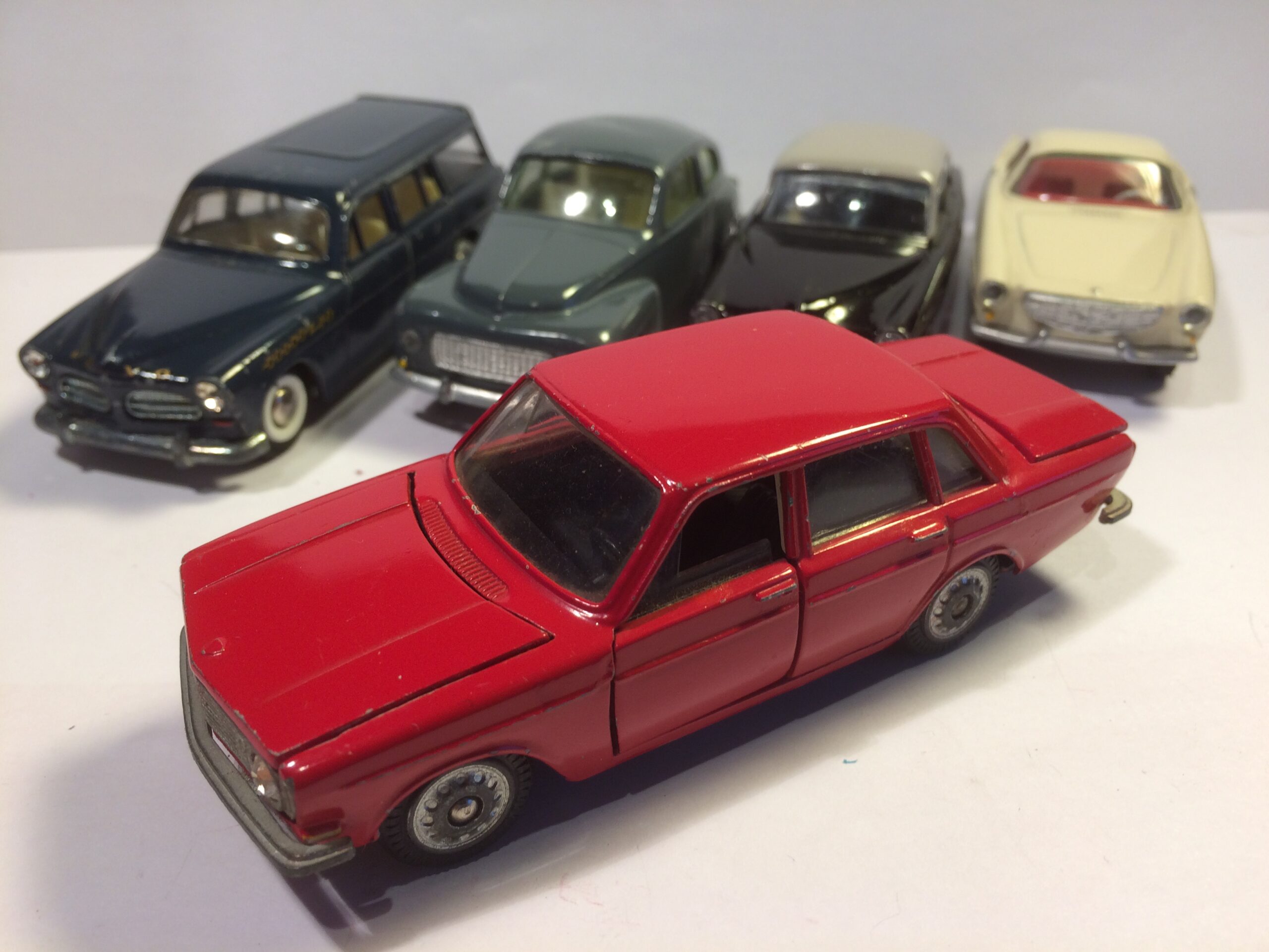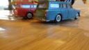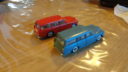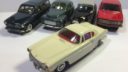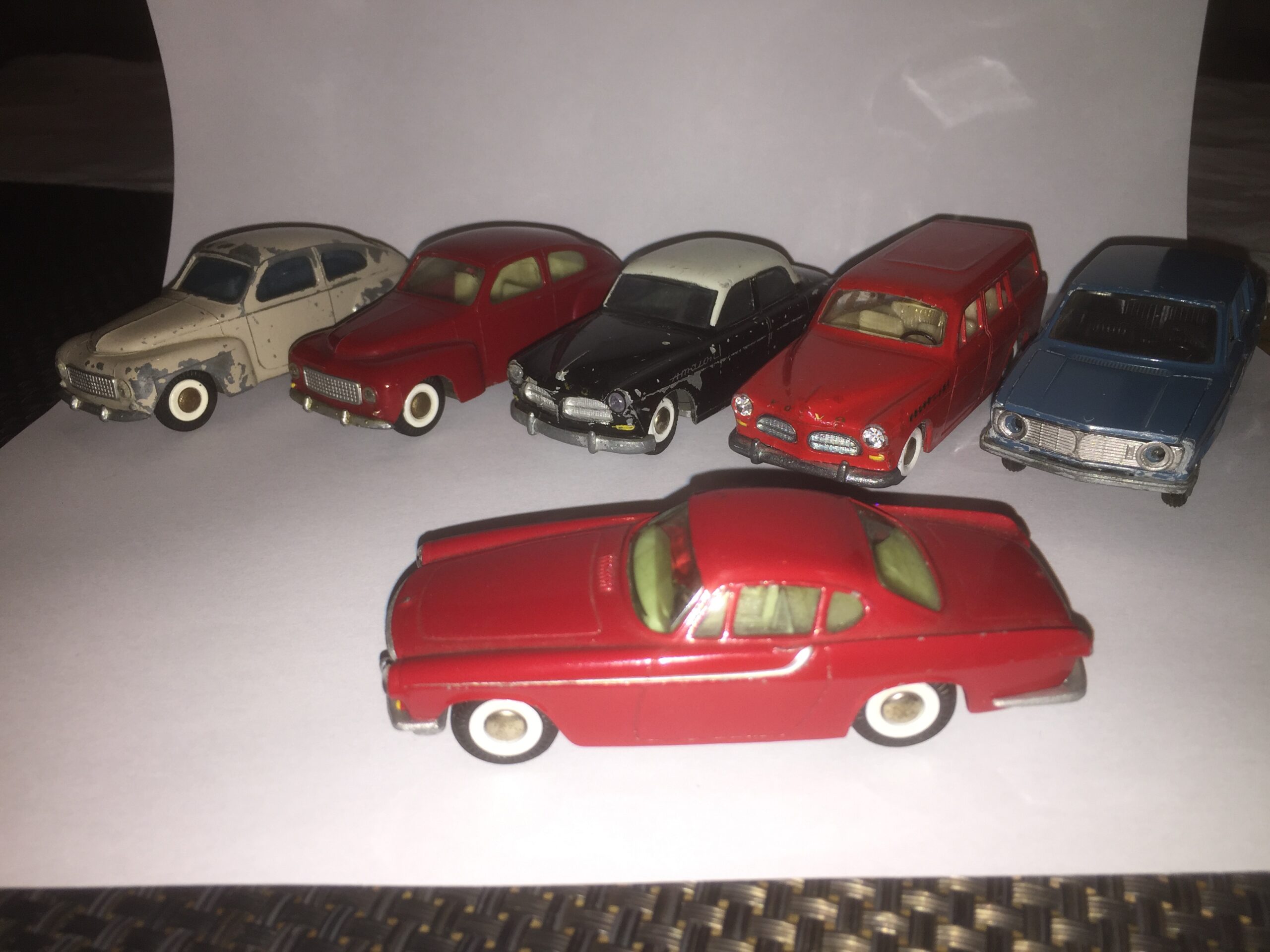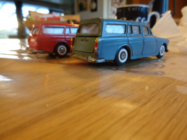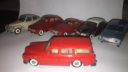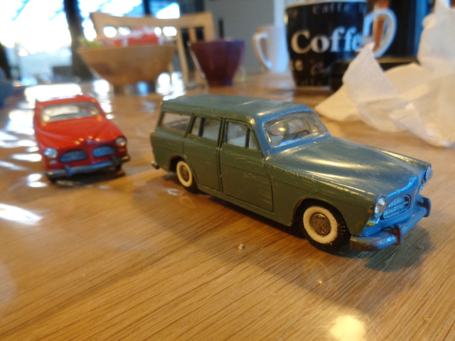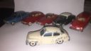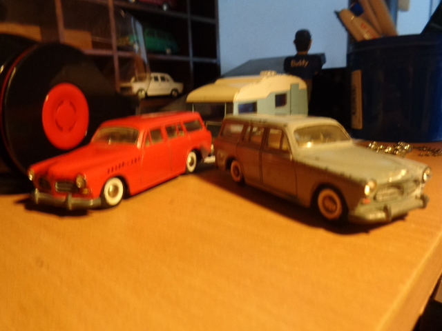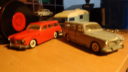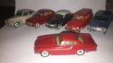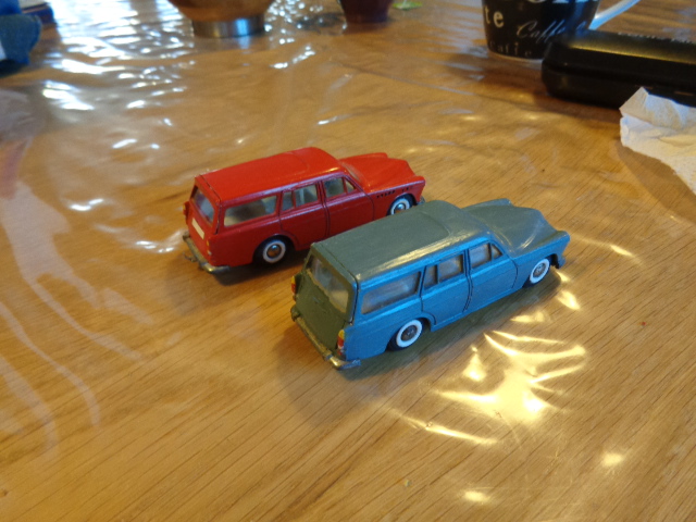 To af dem er den kendte og eftertraktede nr. 830 fra Tekno. Den røde med original maling, bortset fra at baglygterne er malet så man kan se hvad der er blink og baklys, i stedet for gul over det hele, som de er originalt + at jeg selv har lavet anhængertræk til den da Teknos egen anhængertræk ikke kan monteres på den, på grund af manglende hul i bunden. Jeg synes ellers ikke der findes Tekno biler som passer ret meget bedre til at trække en Sprite Musketeer som den. Den hvide tekno model er renoveret med dele fra min skrotkasse + nye ruder og bagkofanger.