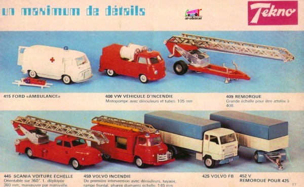 I mine Tekno-kataloger som er fra 68/69 og 71/72 er der kun Volvo og Scania lastbiler med 6 møtrikker på hver hjul, derfor tror jeg at dem med 10 møtrikker kom lige efter plade-hjulene, og før dem med 6 møtrikker. Jeg har ikke styr på årstallene. Men jeg har også en hollansk Tekno Scania tankbil, og der er man tilbage med 10 møtrikker. Jeg har kun en Volvo-kranbil, og det er den helt gamle røde fra Falck med pladehjul uden tagblink. Min efterløber er dog en anelse nyere, da den har hjul med 10 møtrikker, denne er fra Falck Zonen. Sådan kan det gå når man kun finder en del af gangen, men selvfølgelig bedre end ingen.https://www.dropbox.com/sh/kfcw6rqmwlkmkdx/VxTaw6uA4H