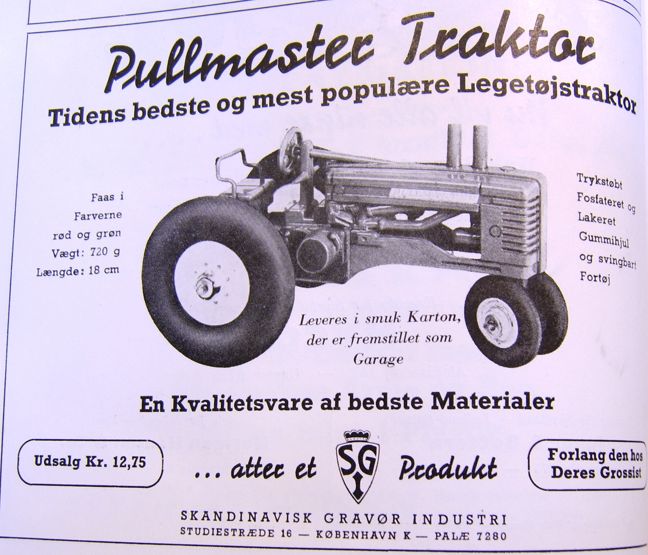 Jeg har fundet en gammel annonce fra 1950, som er mit bedste bud på fabrikanten/forhandleren af Pullmaster traktoren. Den kommer fra Skandinavisk Gravør Industri, som lå i Studiestræde 16 i København. De har sikkert fremstillet traktoren, især hvis dækkene er mærket Made in Denmark, men det er formentlig en kopi af en amerikansk traktor. Den vejer 720g og er 18 cm lang, så det er noget af en moppedreng./peter