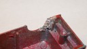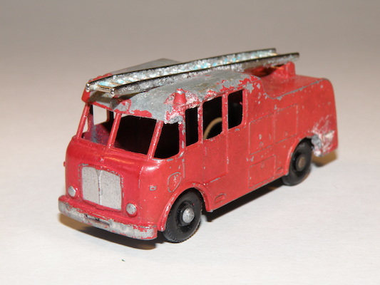 Min lille Matchbox brandbil er så relativt billig, at den valgte jeg at kassere. Stigen var dog uden fejl med fin krom, og er gemt sammen med hjul og aksler. Ved det ene baghjul har pesten smittet bunden, der var ved at blive misfarvet.