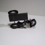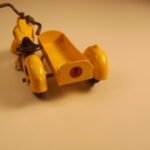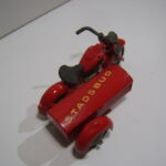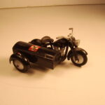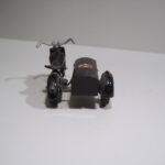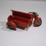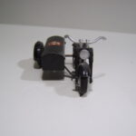 Den åbne varekasse er fremstillet i blik. Det er en flot kasse, som er bukket op i et stykke. Skærmen er ikke støbt som på modellen ovenfor, men også fremstillet i blik, som er fastgjort på sidevognskassen. Da der ikke er løs bund i kassen, er der præget to bøjler direkte ud af bunden som fæste for hjulakslen. Det er smart fundet på. Blikstykket som forbinder mc og sidevogn er svejst fast på bunden og fastgjort med en 1/8 tomme skrue.