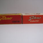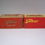 Den ældste har hvid baggrund under illustrationen, hvor den nyeste har gul baggrund. På den ældste står der “Tekno Kvalitet” på den ene side af æsken, og “Tekno Legetøj” på den anden side. På den nyeste står der dels “Tekno” og “Tekno Legetøj”.