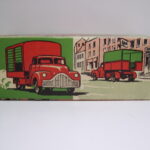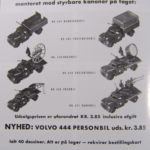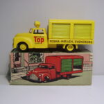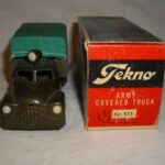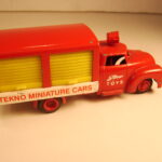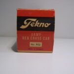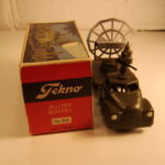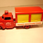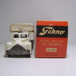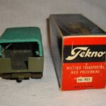 Teknobilerne var lidt senere på den og jeg er første gang stødt på den i en annonce i Legetøjstidende fra juni 1955, altså et år senere end Vilmers. De første var mandskabsbilerne, men allerede i august samme år fulgte flere efter.