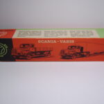 Altså en særlig reklame fra (Scania) Vabis for at markere et særligt langt køretøj på 24 m. Det giver jo pludselig mening – hvis bilen er lavet specielt i starten af 1960.erne formentlig omkring 1963 på grund af hjulene. Jeg tror ikke den er solgt i butikkerne, men udelukkende uddelt fra Scania i en periode. Noget som både Scania og Volvo brugte en del. Da den har sit eget element – godt nok i træ – og sin egen tegning på standardæsken har Scania sikkert måtte aftage en pæn position, formentlig ikke under 5.000 stk., som var det tal Tekno helst skulle lave ved særproduktioner.