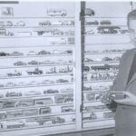 På ovenstående billede ses Teknos salgschef Poul Fjeldgaard foran Teknos berømte udstillingskab. I skabet findes mange flotte biler og ikke mindst Solidos modeller side om side med Teknobilerne. Men på nederste hylde blandt prototyperne – hvor der blandt andet ses en Volvo Express tankbil fra Karoline Malkeko og en kølebil fra Norden, men også en Scania betonbil med “Bil i Bygge” element på ladet. Når den står i udstillingsskabet hos Tekno, har kunder der har besøgt fabrikken formentlig kunne bestille den. Det gør det uendeligt svært at beskrive nøjagtigt, hvilken historie bilerne har.