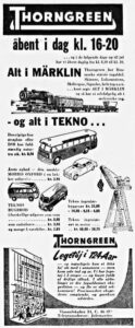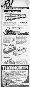 Ovenfor annoncer i Politiken fra Thorngreen Legetøj fra den 27. november 1955 til venstre og fra 18. december 1955 til højre. Nedenfor annoncer i Politiken fra Rønberg Legetøj fra den 4. december 1955 til venstre, i midten og til højre annoncer i Politiken fra Illums julekatalog 1955 og fra julekataloget fra 1957.